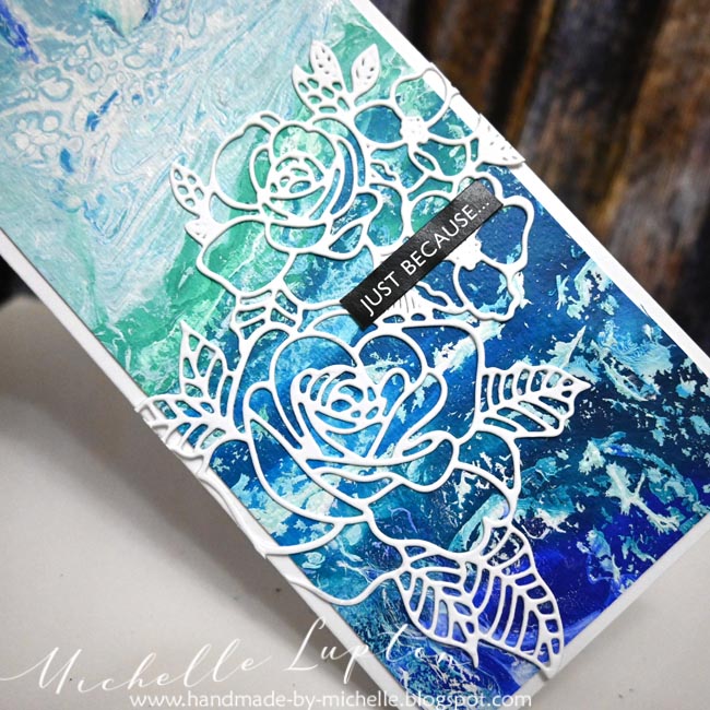 I took the acrylic paint pour panel and cut it to fit onto a slimline card front with a small white border. I added the Rose Bloom die with some liquid adhesive, and then added a printed sentiment.