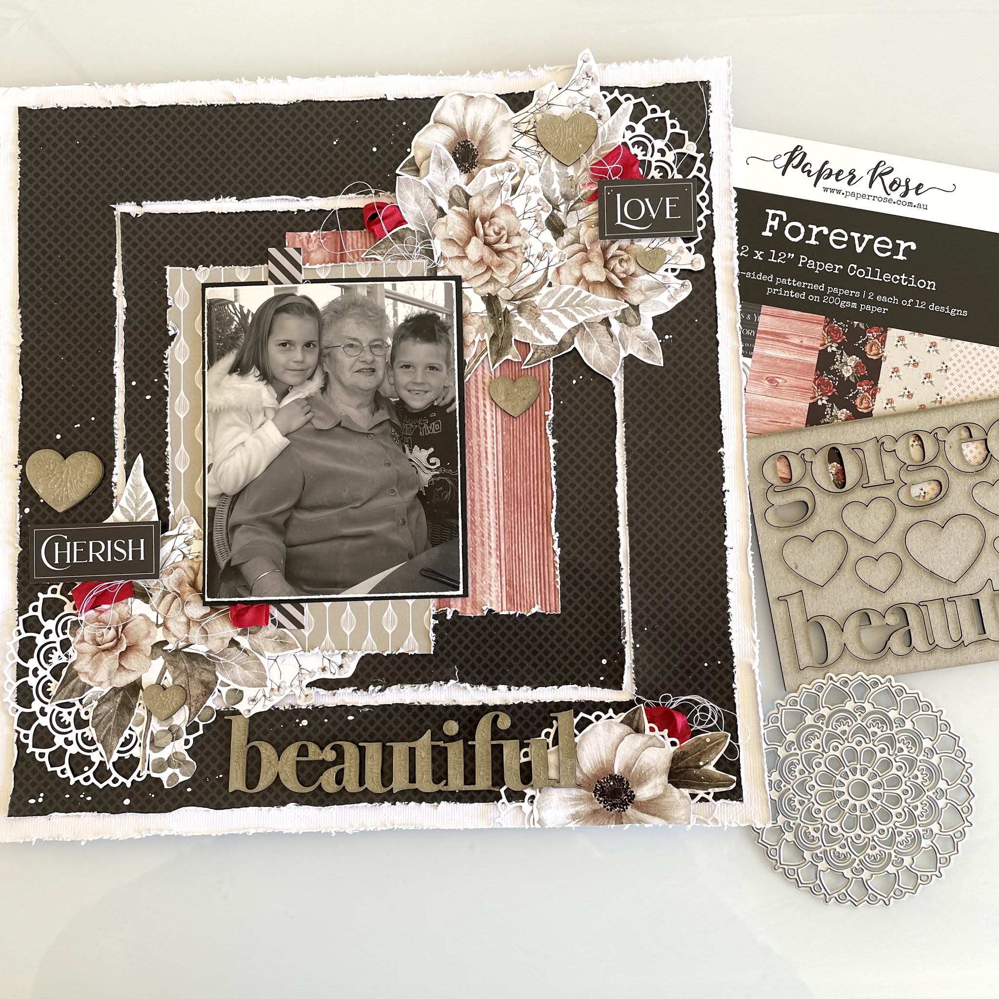 To create this layout I cut the black paper 28.5cm x 28.5cm to allow the white cardstock to border the layout.