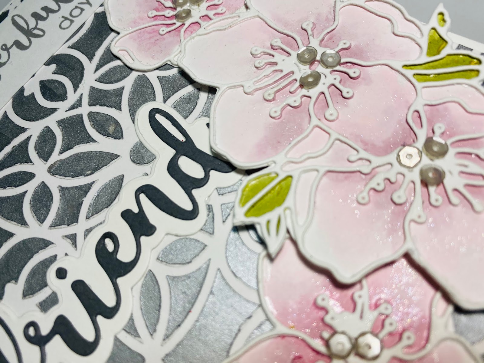 I have then added a few grey sequins to the flower centres and my stamped and die cut sentiment.