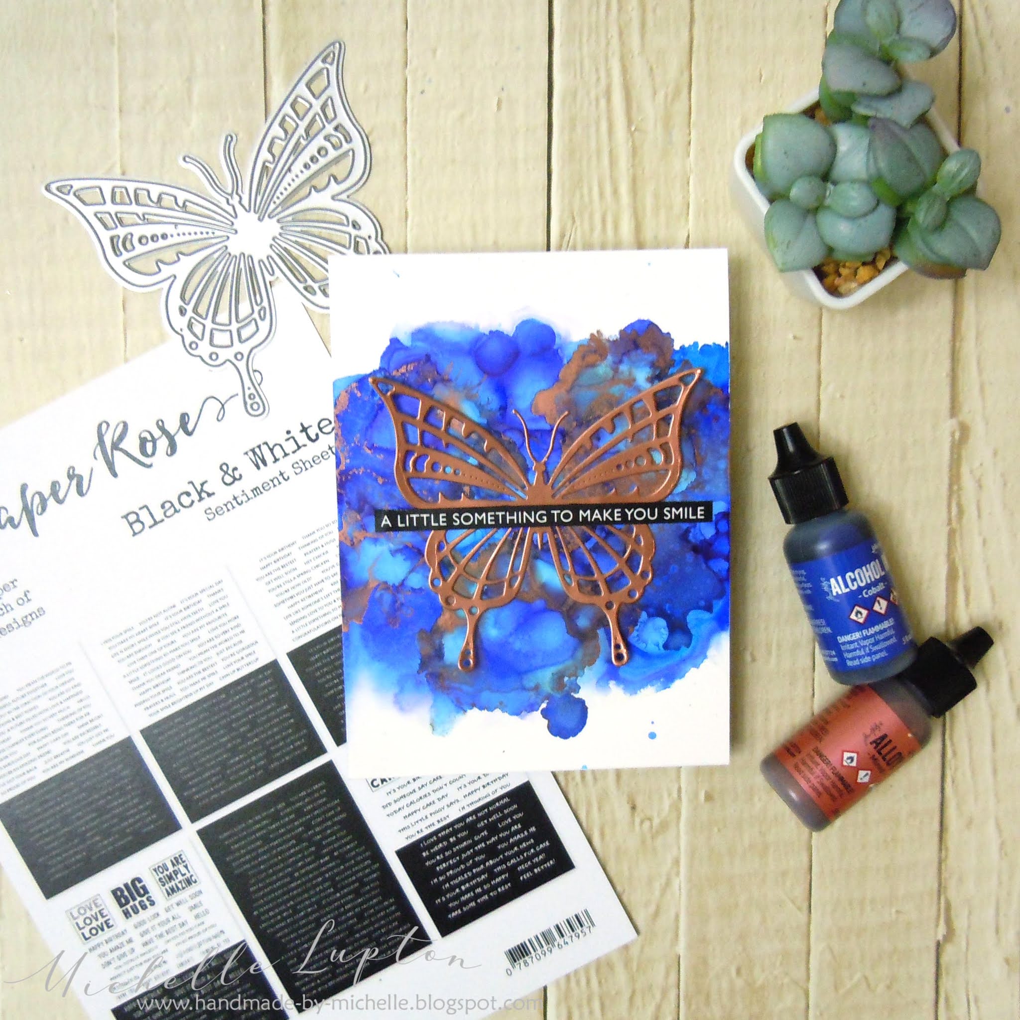 I started with a panel of Yupo that I added some cobalt blue alcohol ink and bronze coloured alcohol ink alloy to. I cut the butterfly die from Paper Rose from some metallic bronze cardstock from my stash, then added it with a sentiment to the centre of the card. I then stuck the whole panel to a white card base.