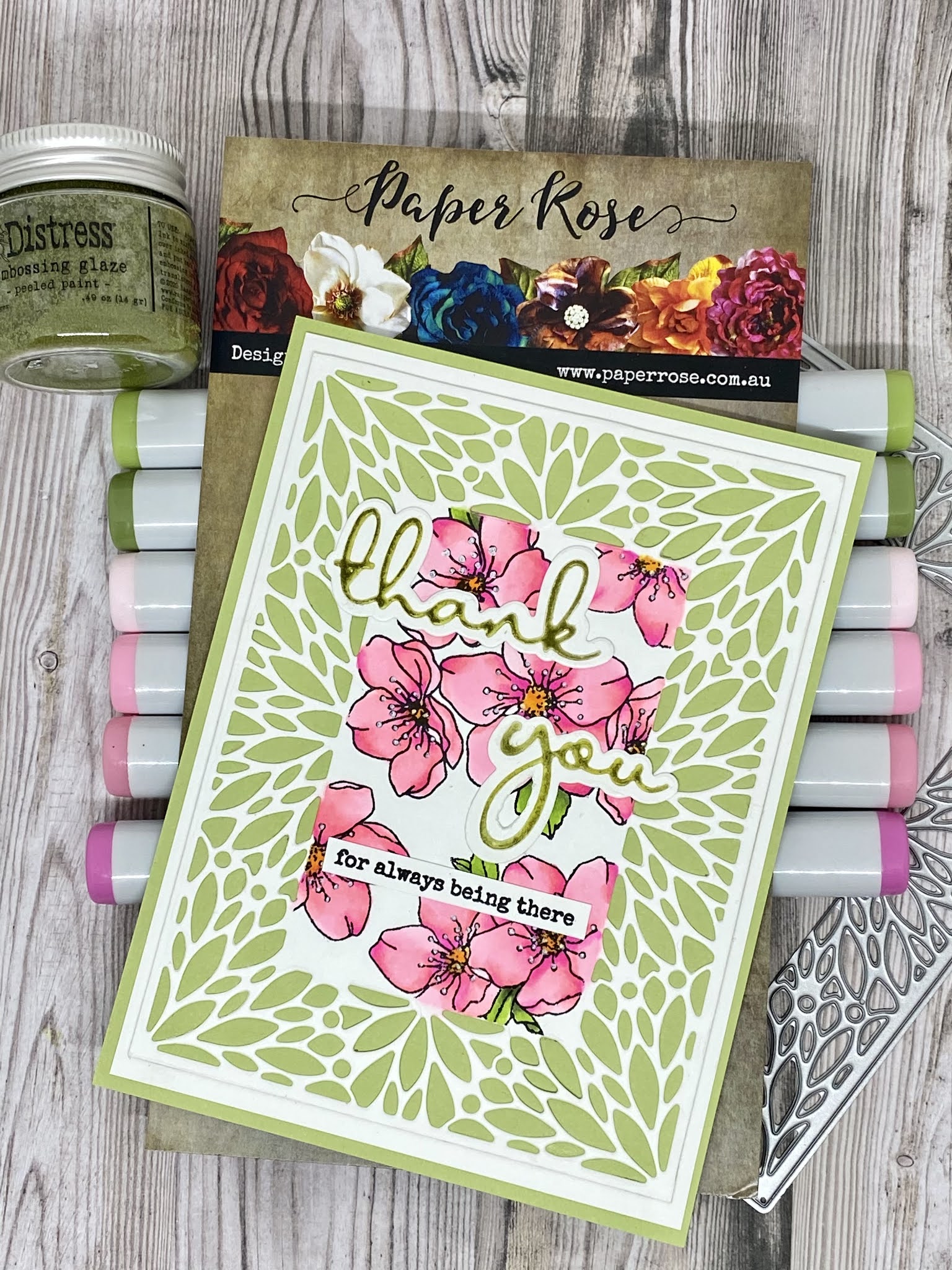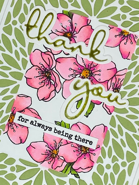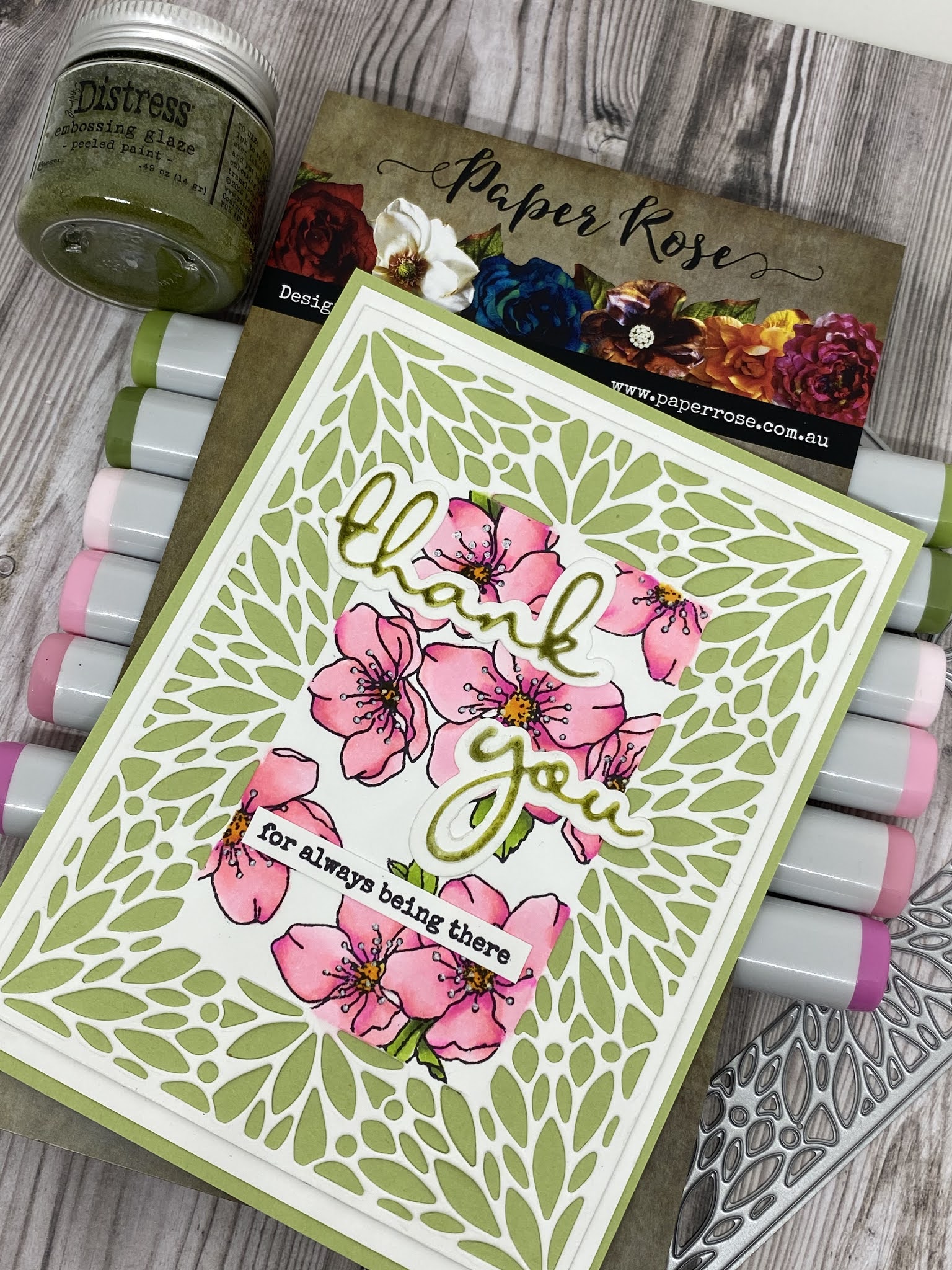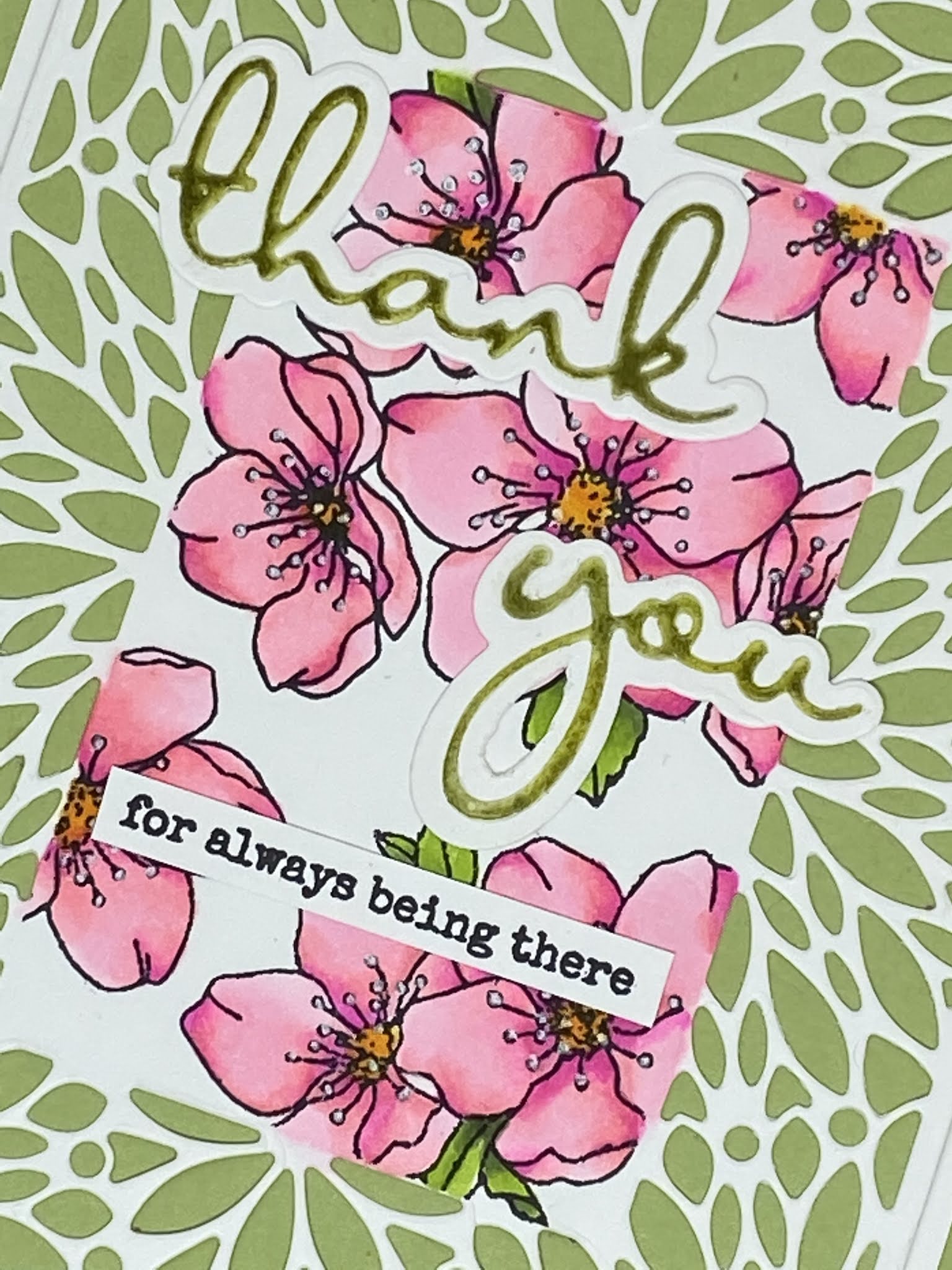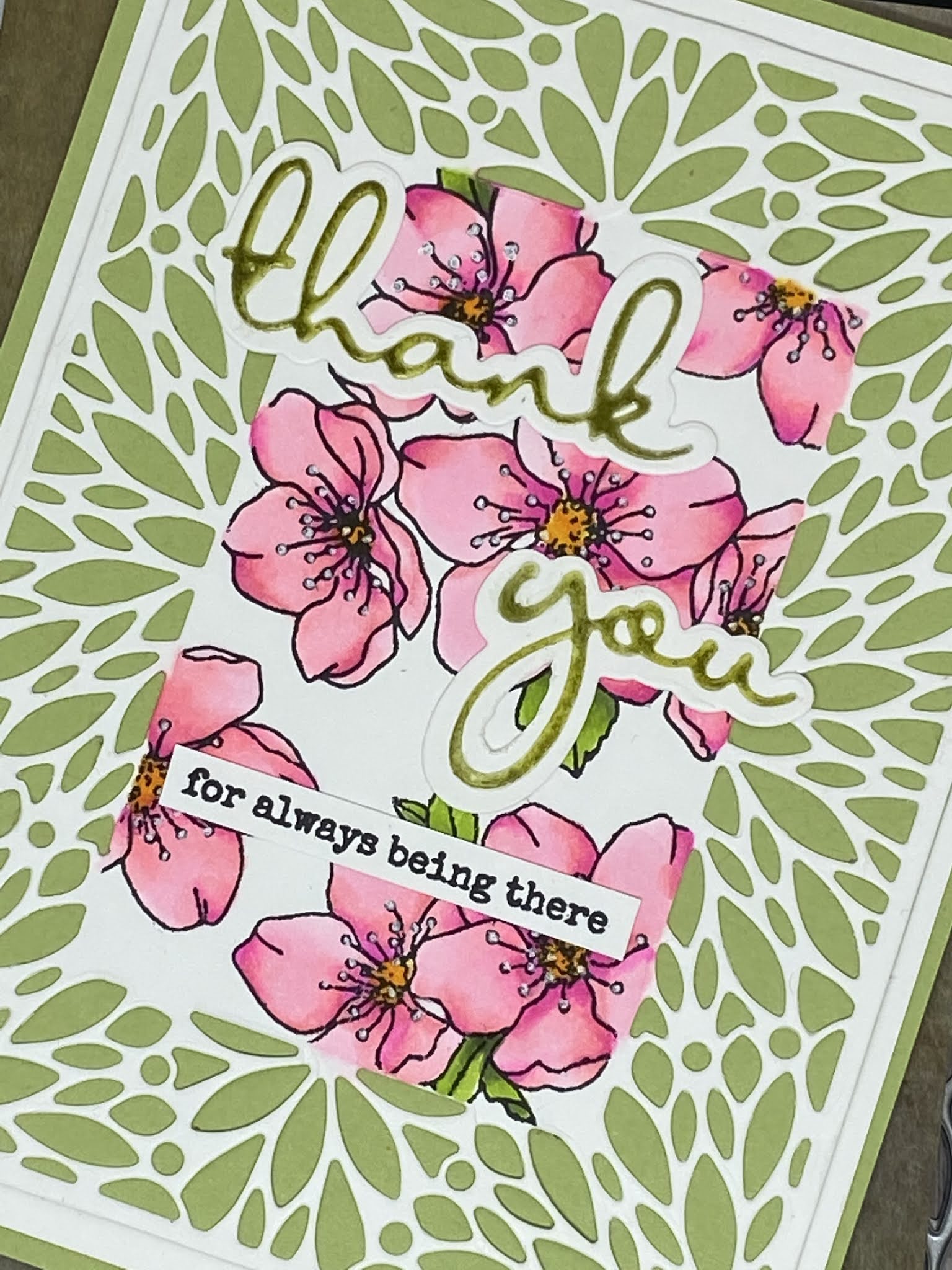 My Thank you sentiment id die cut and heat embossed using distress glaze in peeled paint.