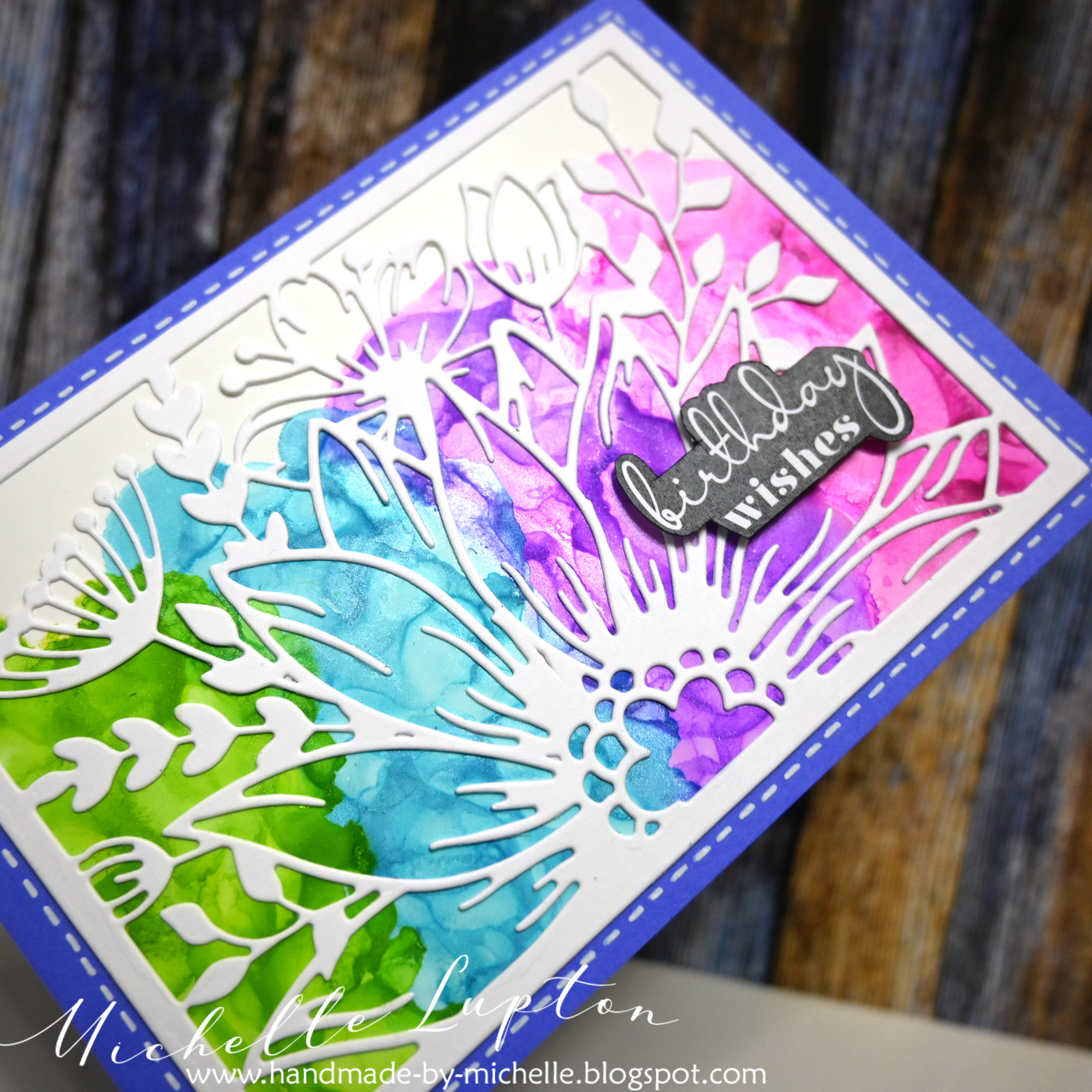 I began with a piece of yupo, and I added some Alcohol Pearl inks. I die cut the Blooming flowers background die from white cardstock, and adhered it over the top of the yupo. I adhered this to a purple card base made from Brights coloured cardstock, added some white faux stitching with a gel pen, and added a printed sentiment from Big Black and White sentiment sheets.
