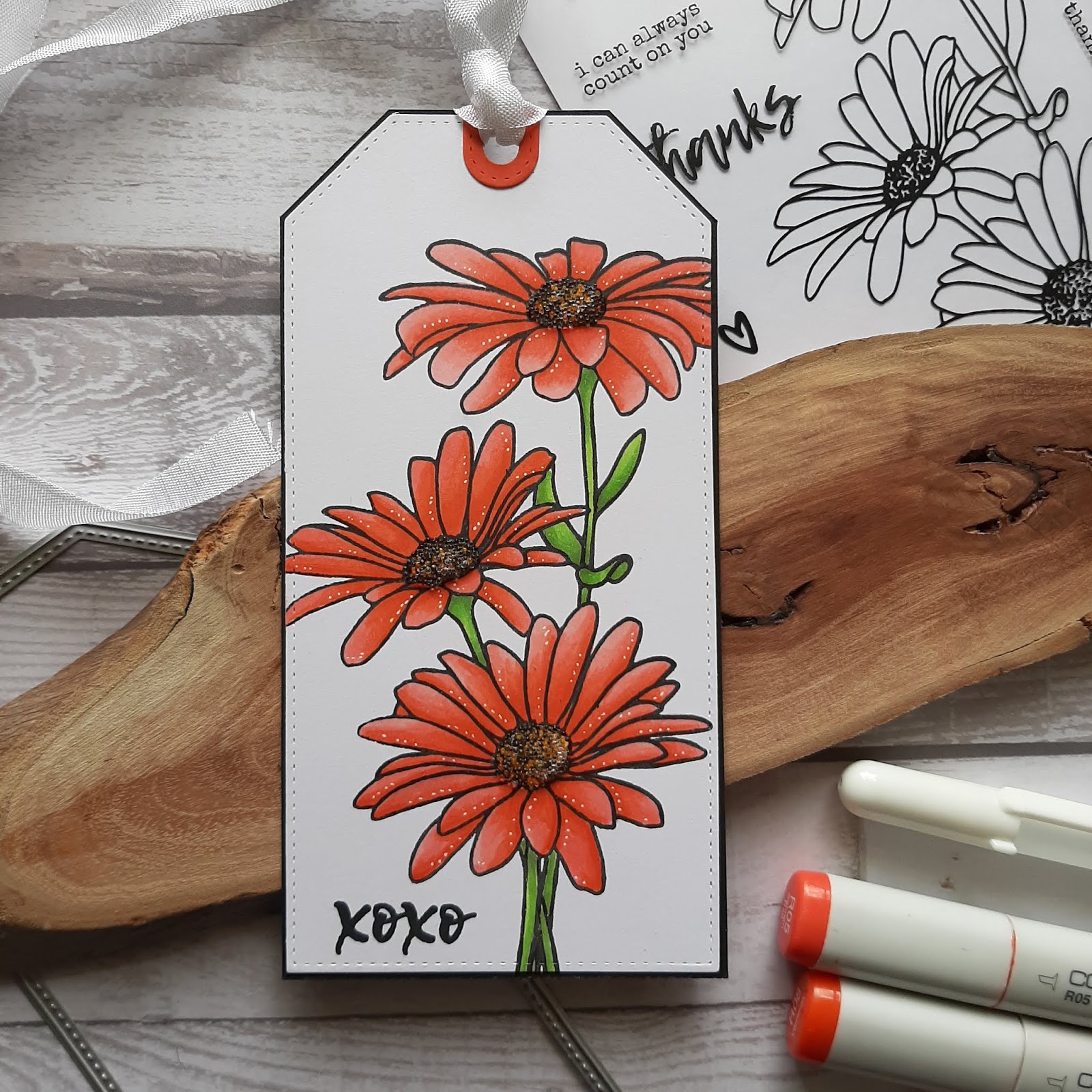 - Stamp 'Daisy Bouquet' onto X-Press It Blending Card and colour with Copic Markers.
