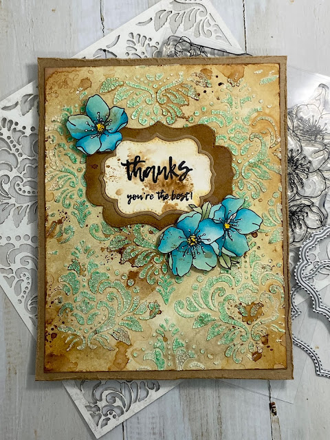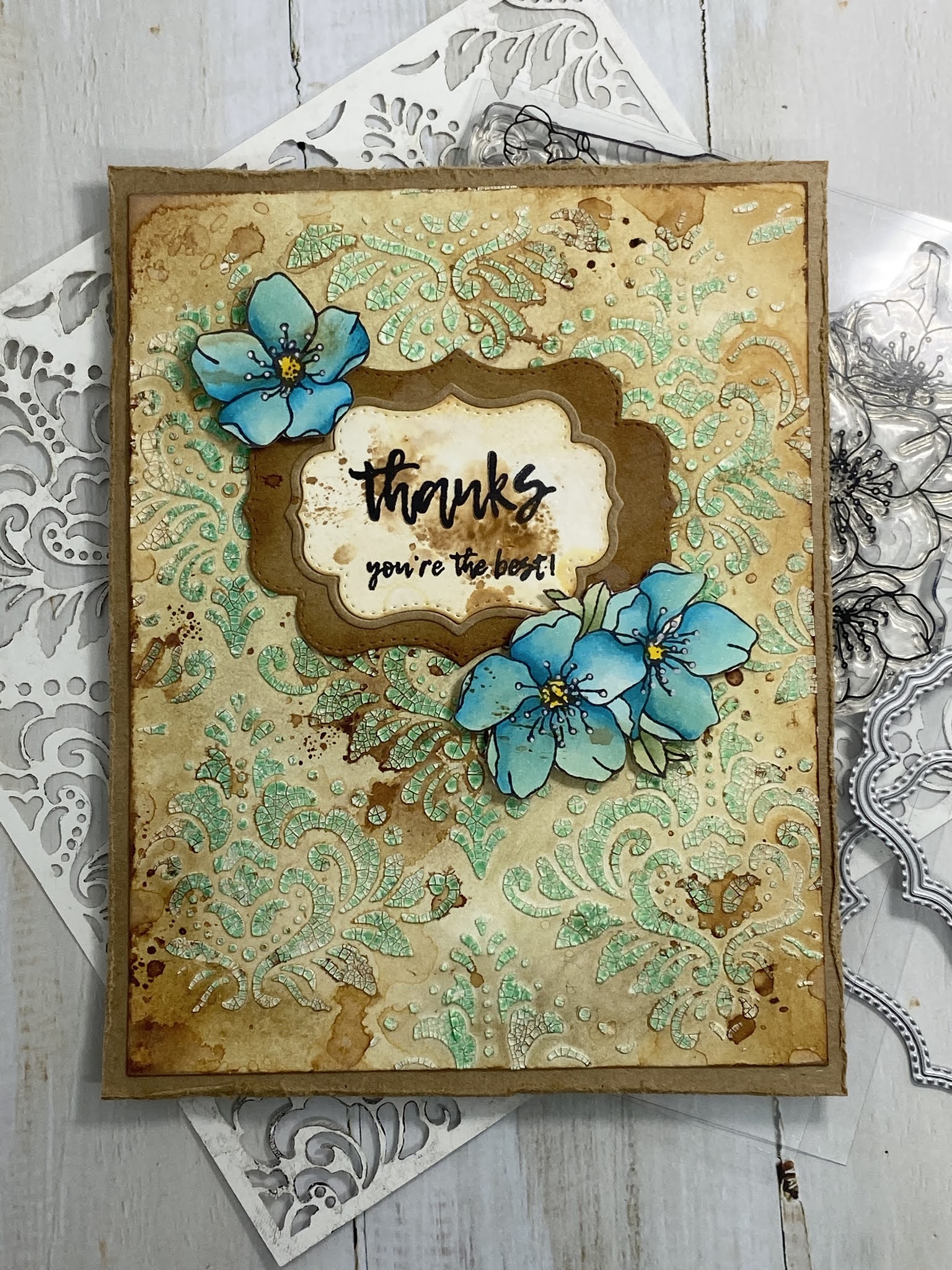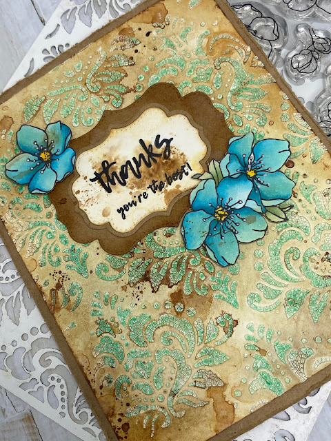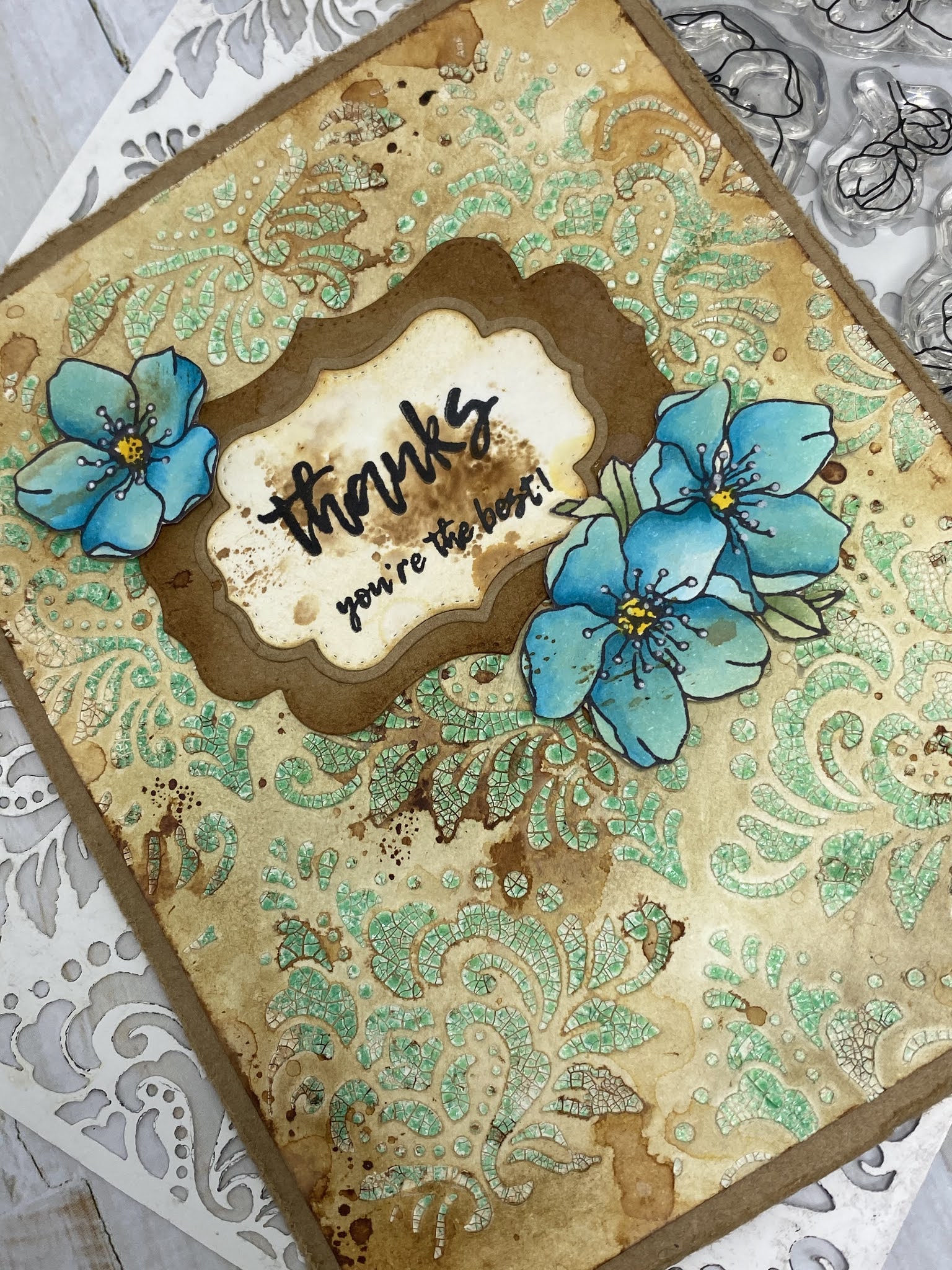 I created the background by using Distress crackle texture paste through my Damask stencil.