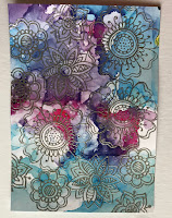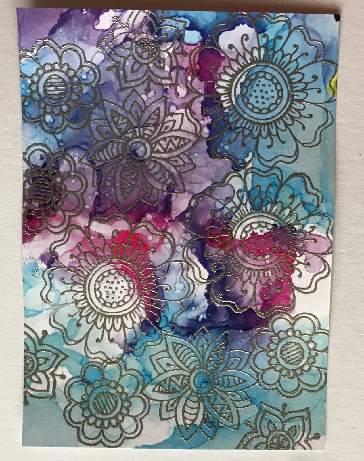 - Randomly stamp Doodle Flowers with Versamark Ink and cover with Silver embossing powder. Heat set.