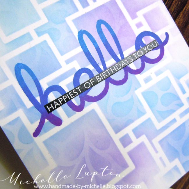 I started by stenciling with the Stacked squares stencil using Distress Oxide inks in Blueprint Sketch, Salty Ocean and Wilted Violet. I then added the Small Drops stencil over the top of the first one and added more ink - I tried to keep the same colours in the same areas of the card. I stamped the Hello stamp using my MISTI so that I could stamp multiple times to get an ombre effect with the three different ink colours. I finished with a printed sentiment from Black and White sentiments.