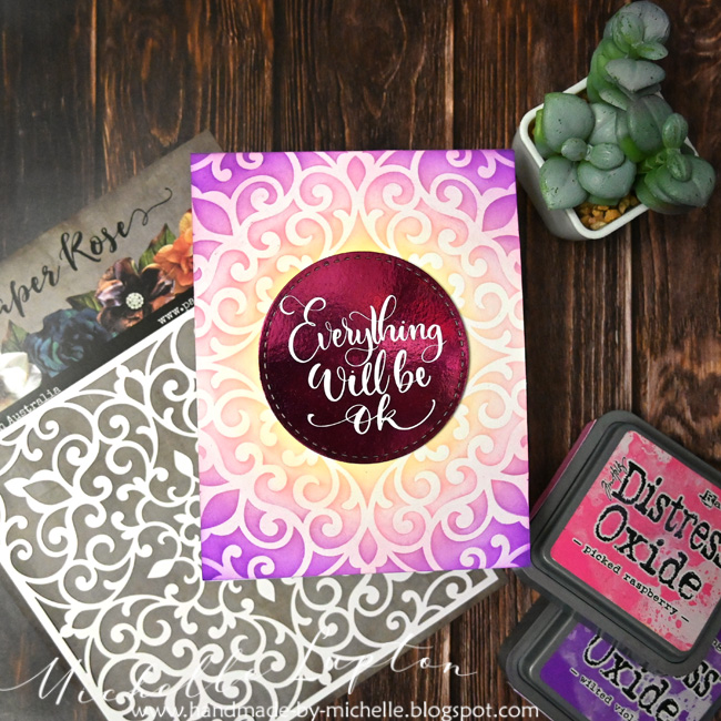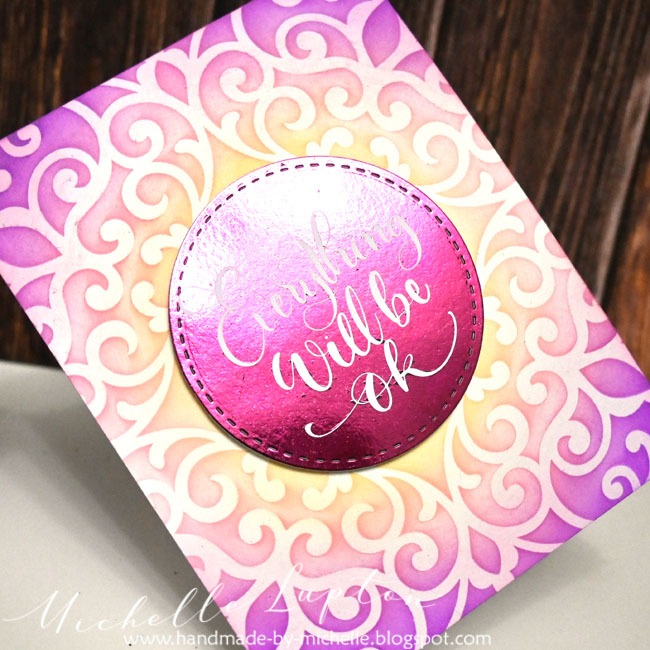 I cut out the "everything will be OK" sentiment with a stitched circle die, and then ran it through my Mini Minc machine with hot pink foil, before adhering the circle in the middle of my stenciled card front.