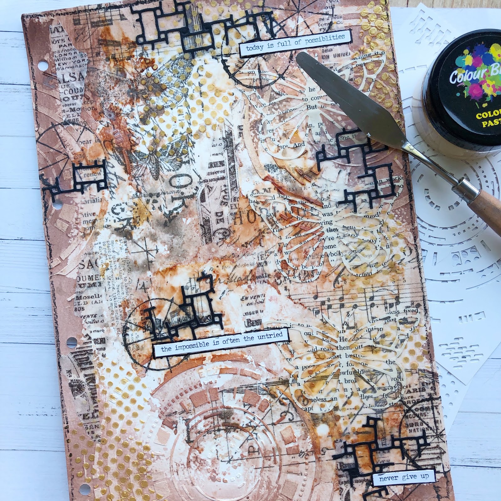 I stencilled using the Half Tone Stencil and some Colour Blast paste. The paste gave a nice shimmer to the stencilled circles.