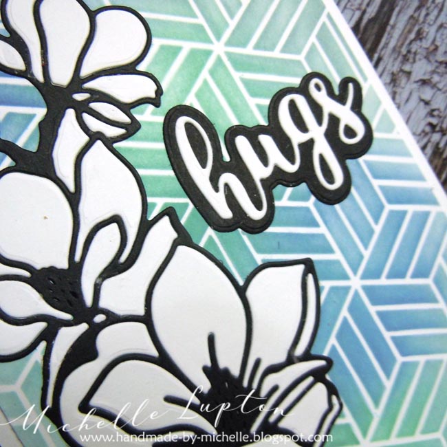 I began by ink blending over the Stacked Blocks stencil in Distress Oxide inks. I cut the panel down and adhered it to a white card base. I cut the floral image and the sentiment from both white and black cardstock and adhered them to the card front, piecing the petals on the flowers back into place.