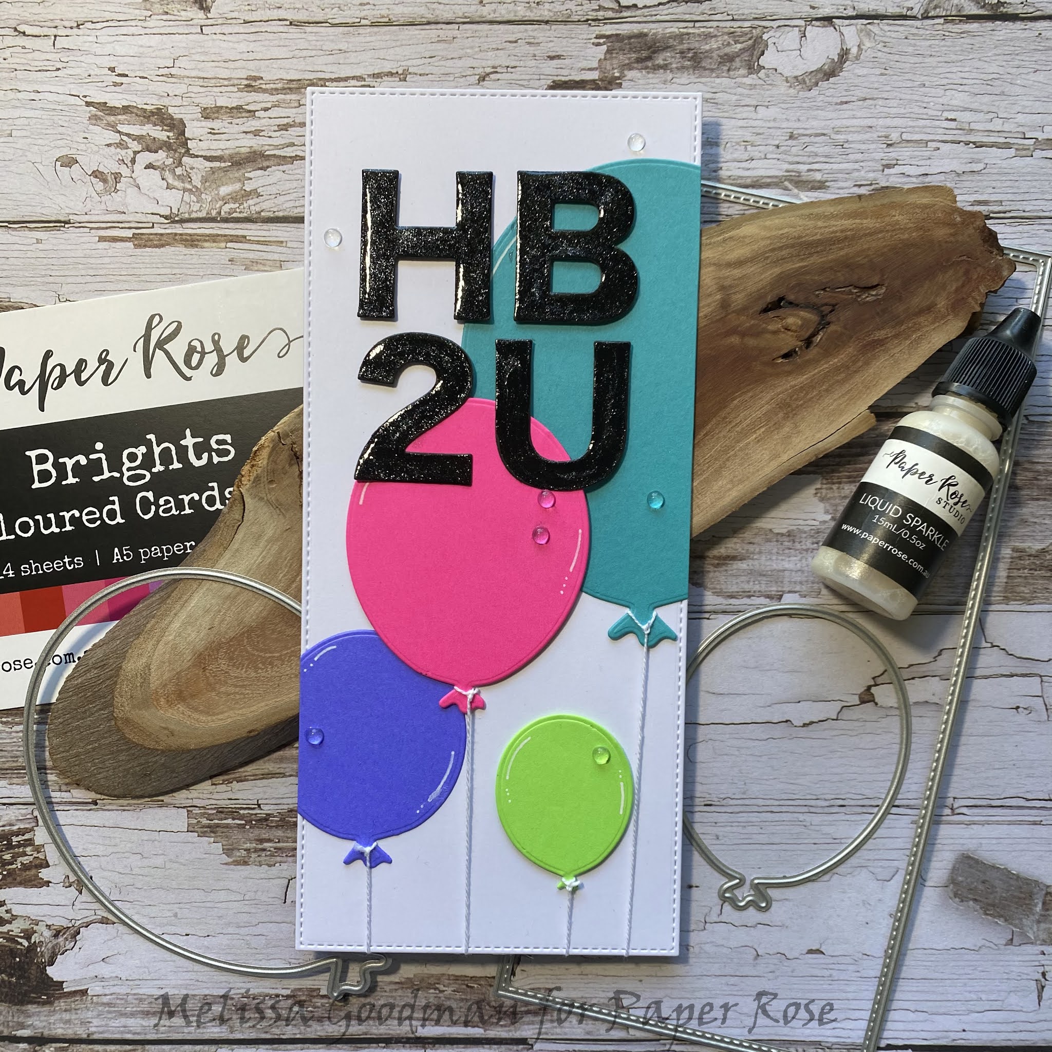 - Cut 'HB2U' from black card and adhere to base card. Apply Liquid Sparkle.