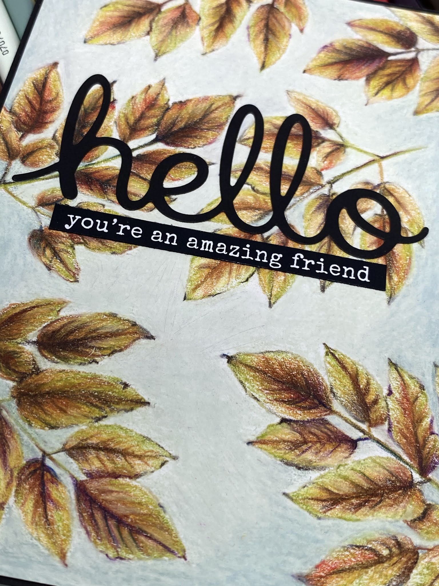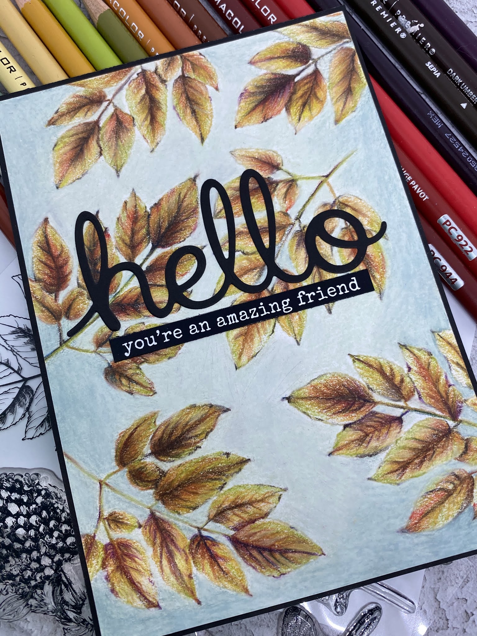 Hello Autumn leaf card in Prismacolor pencils