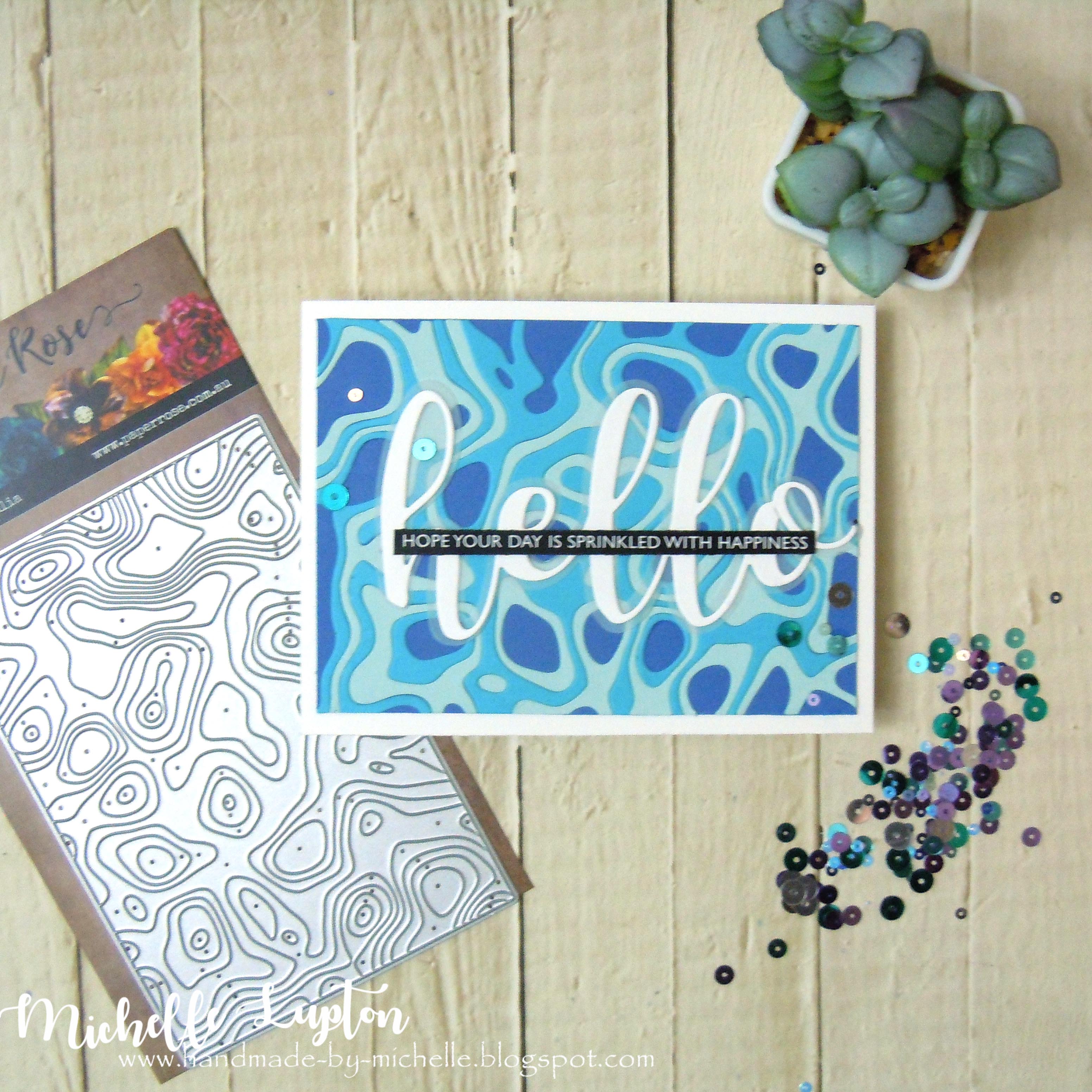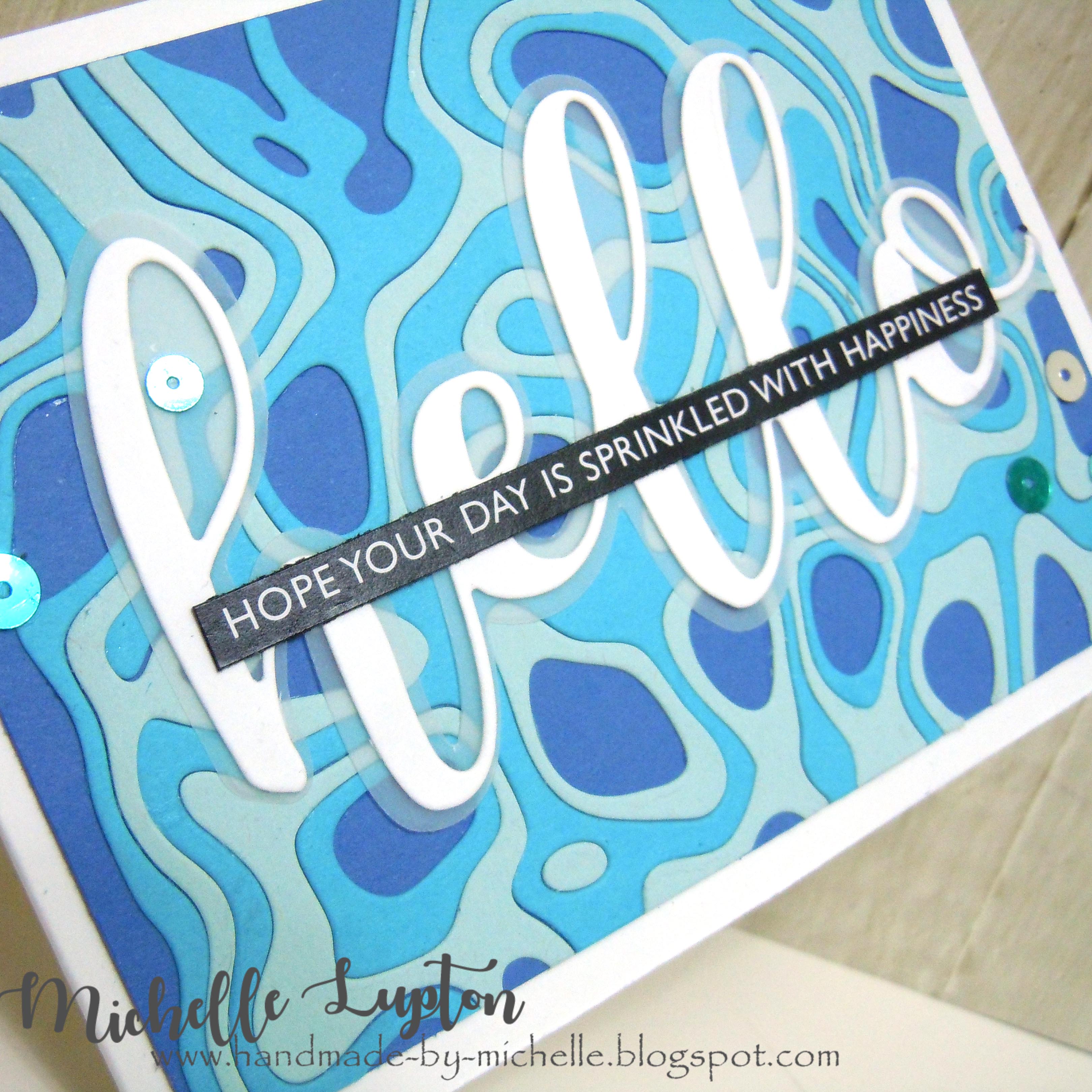I cut the Topographic background die to cut from three different colours of blue cardstock from my stash. I pieced them back together in a fairly random order before adhering to a white card base. I added the Large layered hello die cut from white cardstock and white vellum, and layered a sentiment from the black and white sentiment sheets. I finished with some sequins from Picket Fence Studios.