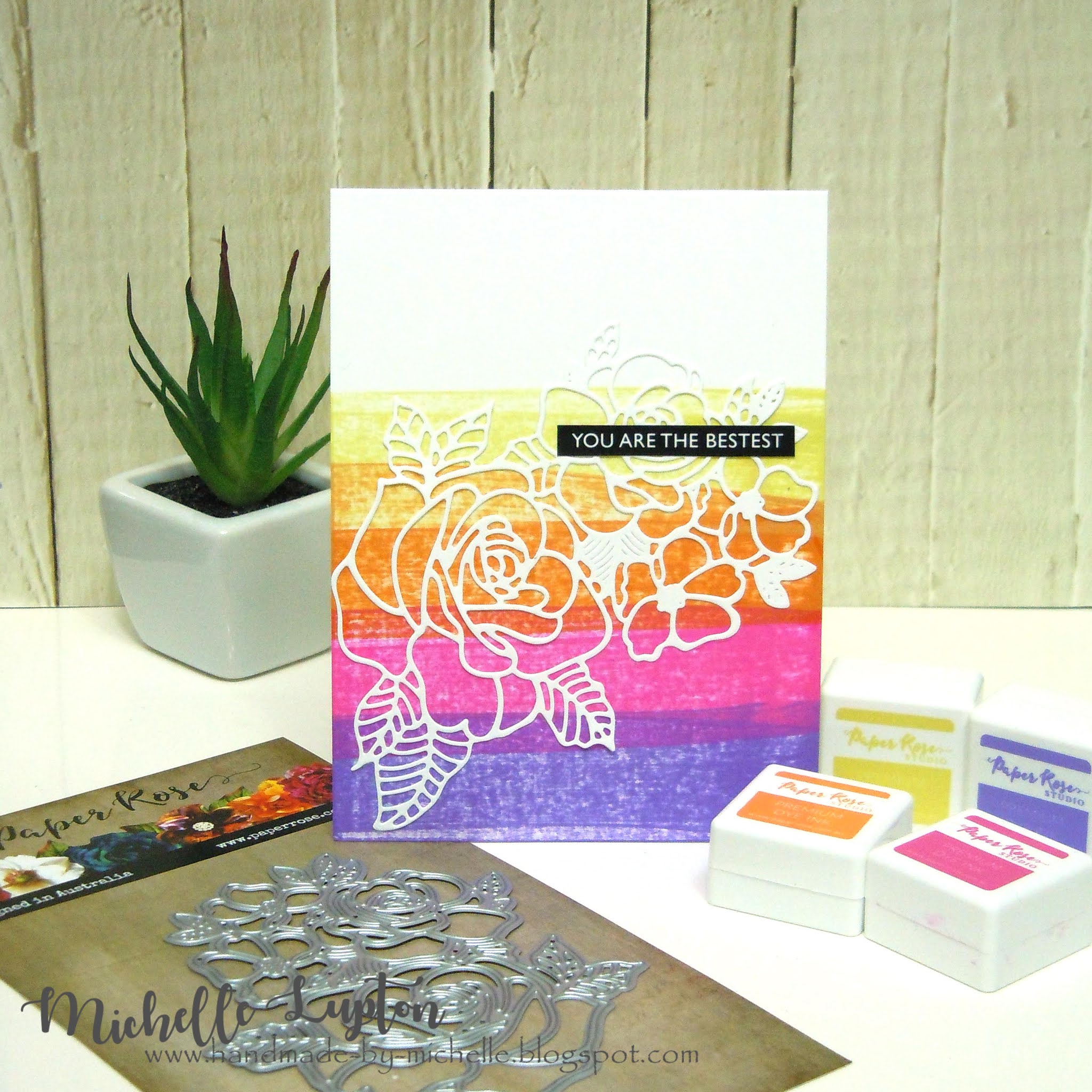 I took four ink cubes from Paper Rose and swiped them across the bottom half of a top folding white card base. I then cut the Rose Bloom die from some white cardstock and adhered it over the top. I finished with a sentiment from Black and White Sentiment Sheets.