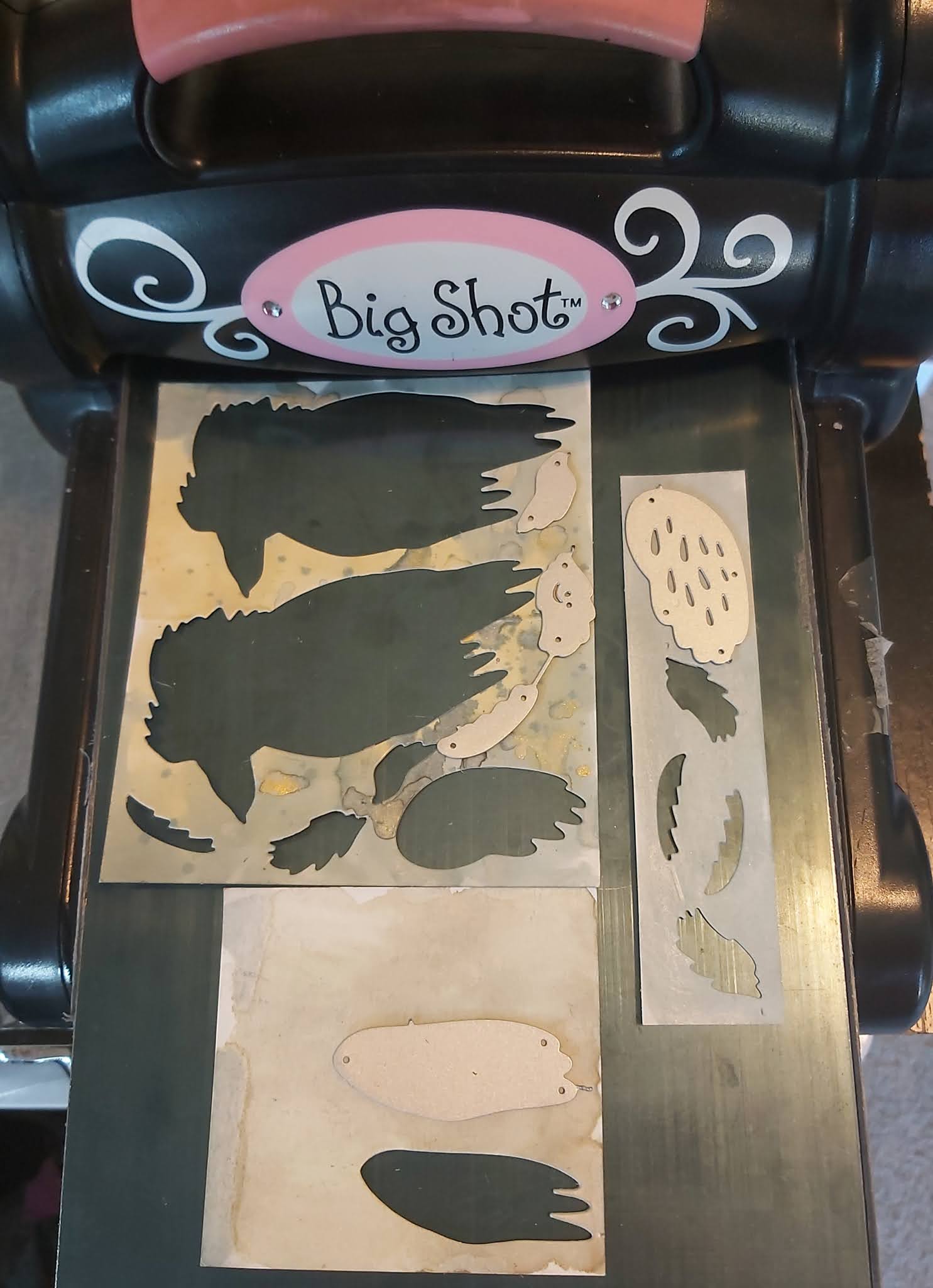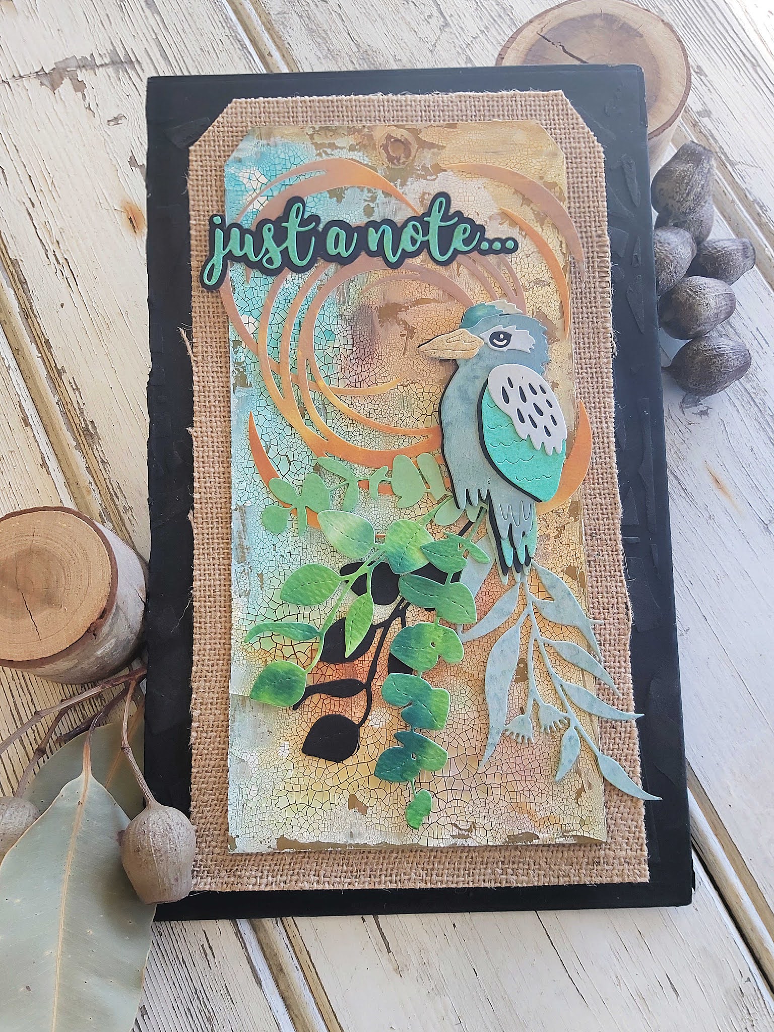The background oversized kraft tag was first smeared with gold embossing paste,