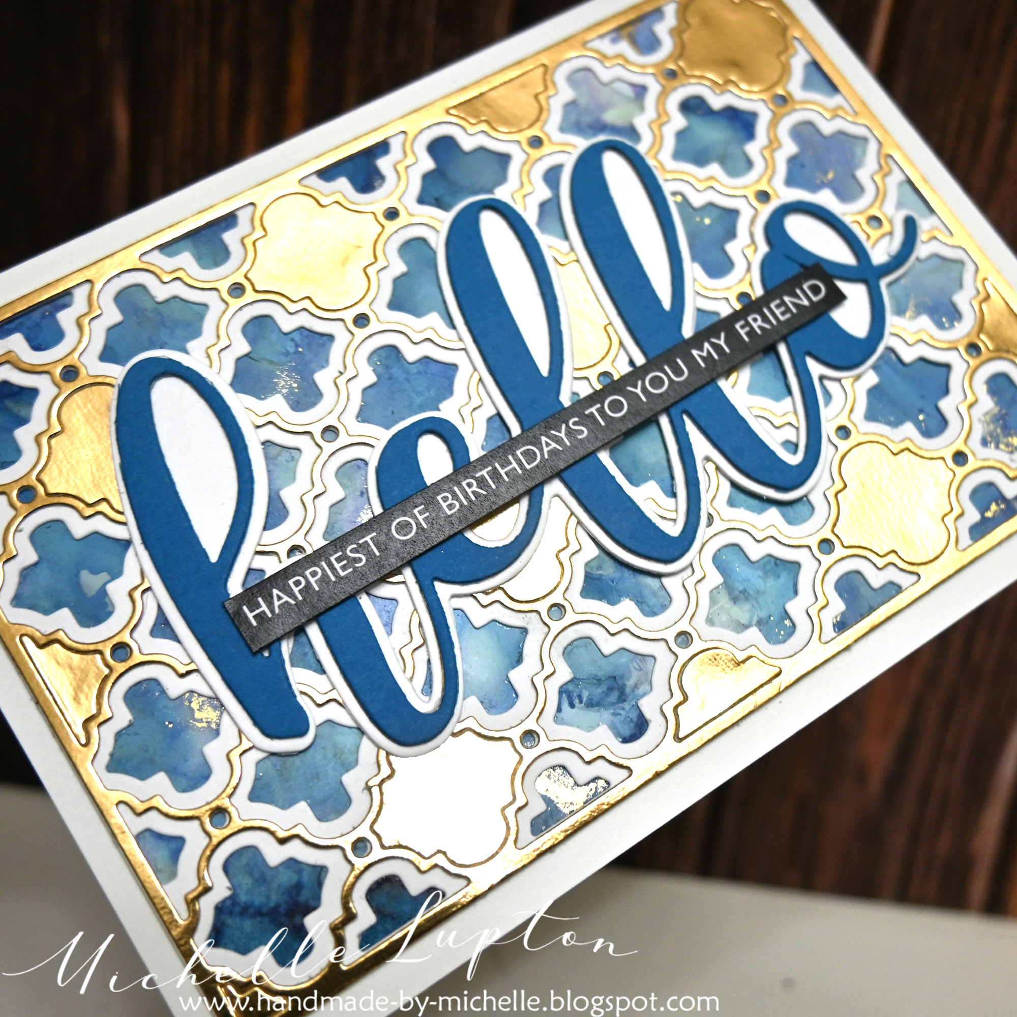 I began with a panel of yupo with some alcohol ink and gold foil. I cut the quatrefoil background 2 cover die from white cardstock and the quatrefoil background 1 cover die from gold cardstock and layered them over the top. I put some of the gold pieces cut by the #1 die back in place, before adding the hello large layered die and a sentiment from Black and White sentiments.