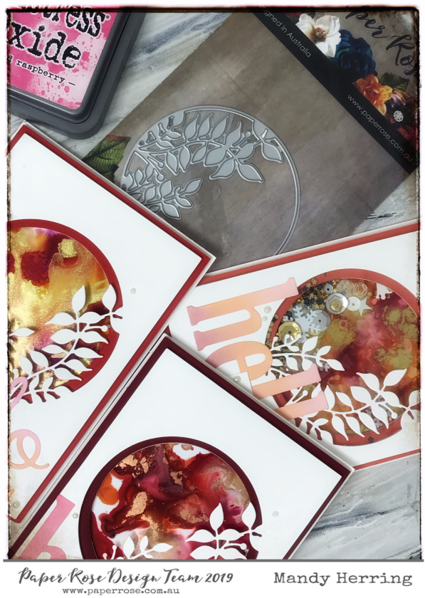 All three cards have an alcohol ink background on Yupo Paper. have selected a complimentary colour of plain yardstick for the second layer of the shadow box. I used a circle die smaller than the Leafy Circle die so only a thin edge shows around the opening.