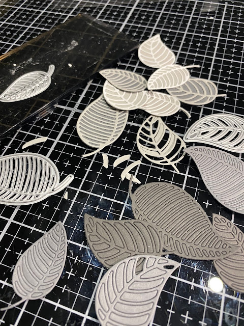 I didn't paper piece all those little bits back in! no way! If you look at the picture above you will see that I have kept some of the leaves intact. I have done this using a layer of press and seal on my card before die cutting.