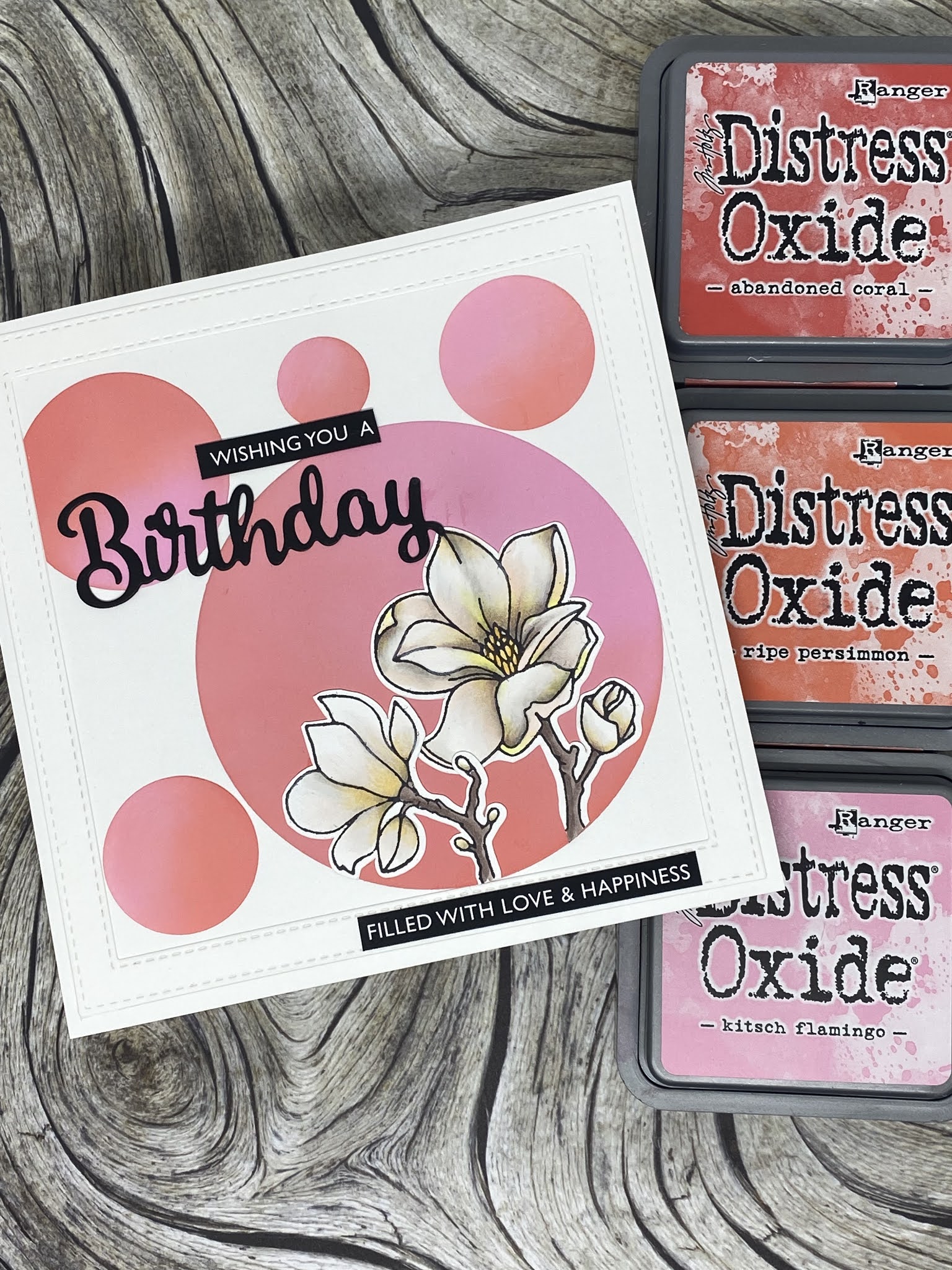 using my blending brush and Distress Oxide inks in Abandoned Coral, Ripe Persimmon and Kitsch Flamingo created a smooth gradient from light to dark.