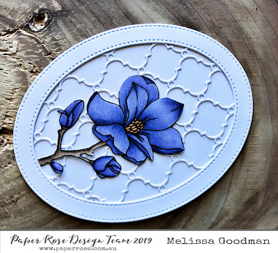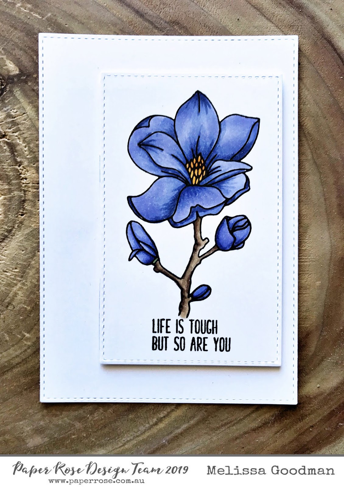 Card: X-Press It Blending Card, 9 x 14cm. Stamp and embossing Magnolia flowers. Colour background around flowers with C9 copic Markers. Then colour flowers.