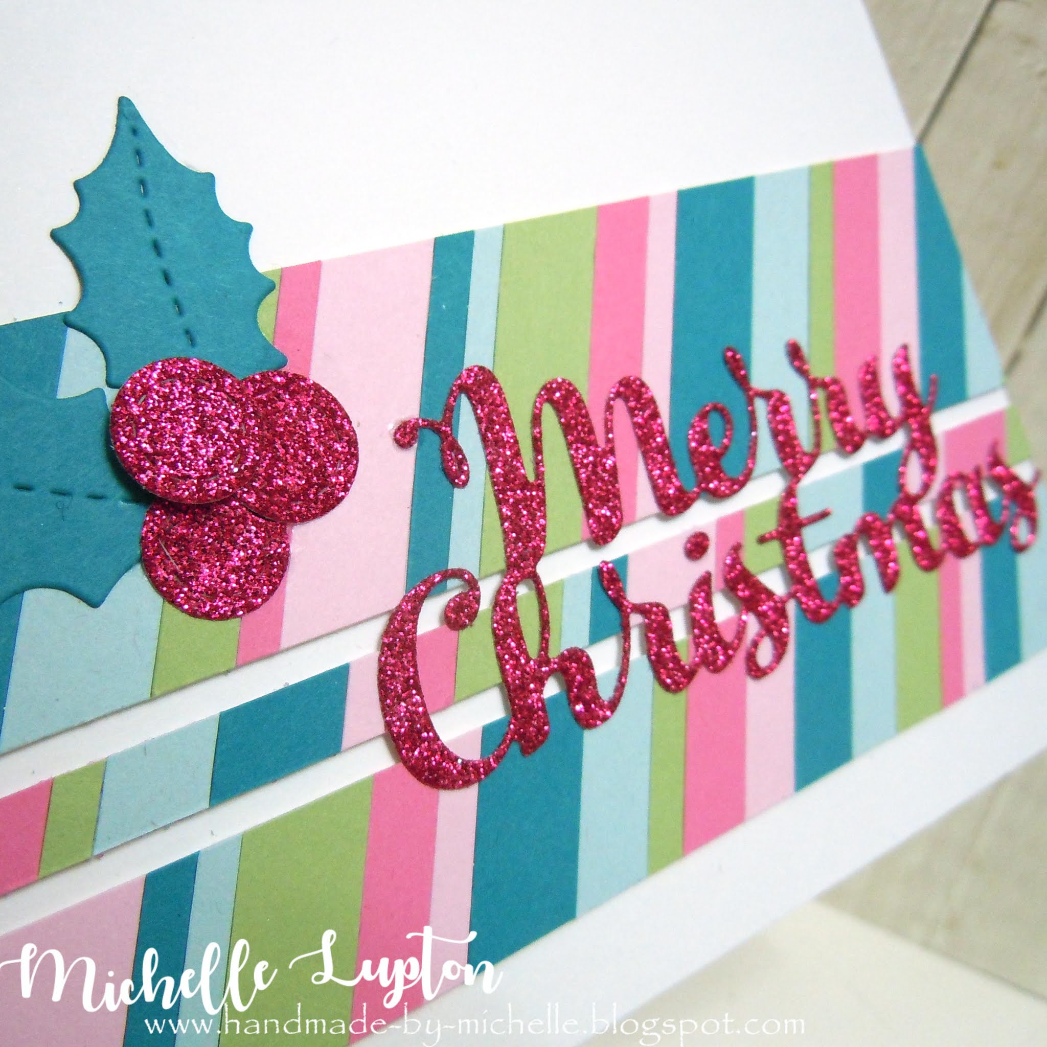 I made a panel of strips of cardstock in pinks, green and teal. I cut this panel into 3 and adhered them offset from each other onto a white card base. I added the diecut sentiment and holly leaves and berries and I was done!