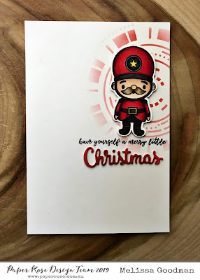 - Onto Xpress It Blending Card, Stamp Soldier stamp and colour with Copic Markers (Colours used are listed above). Fussy Cut and set aside.