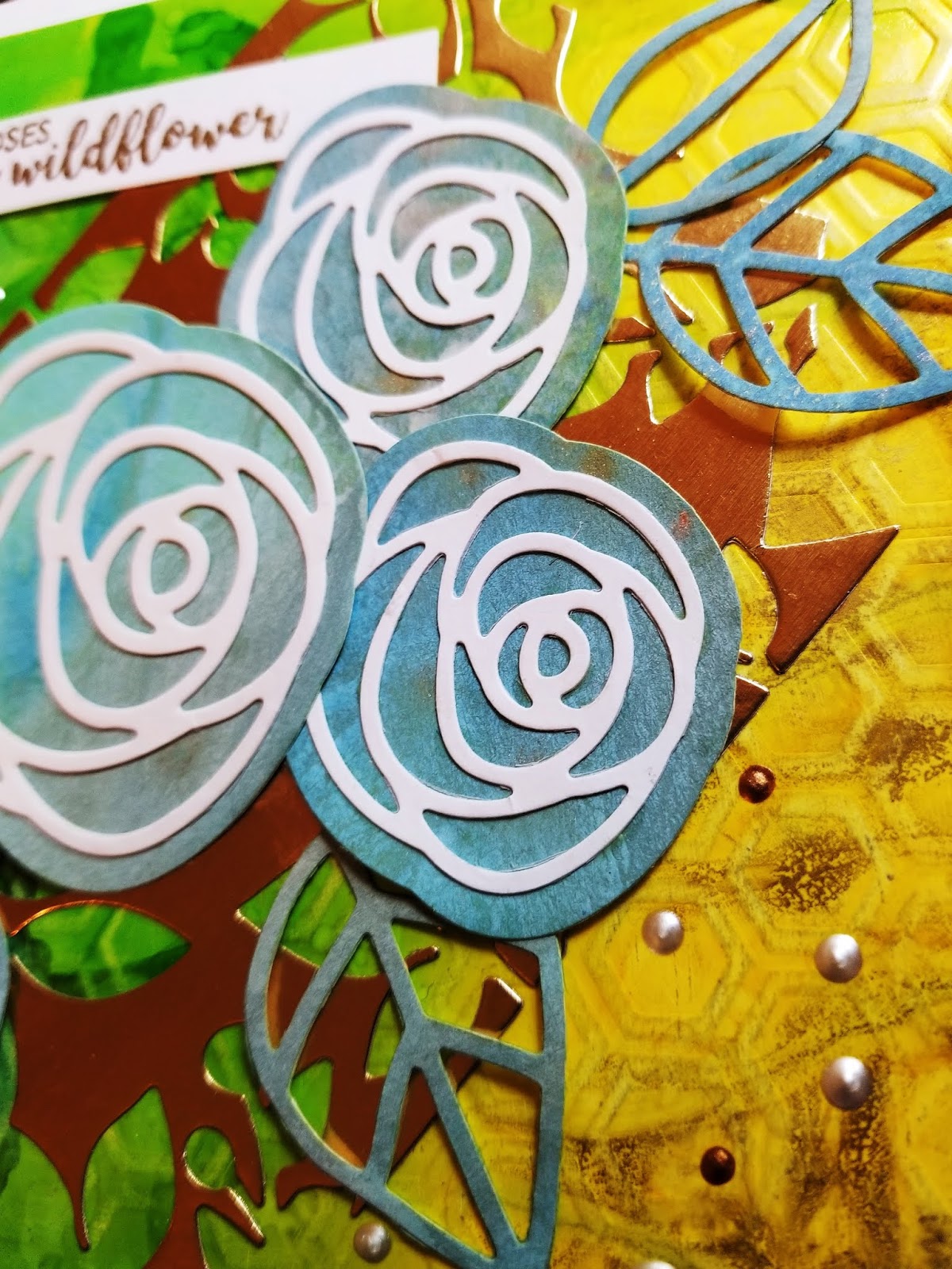 layered over the negative space diecut from gold cardstock of the Rose Frame Background die.