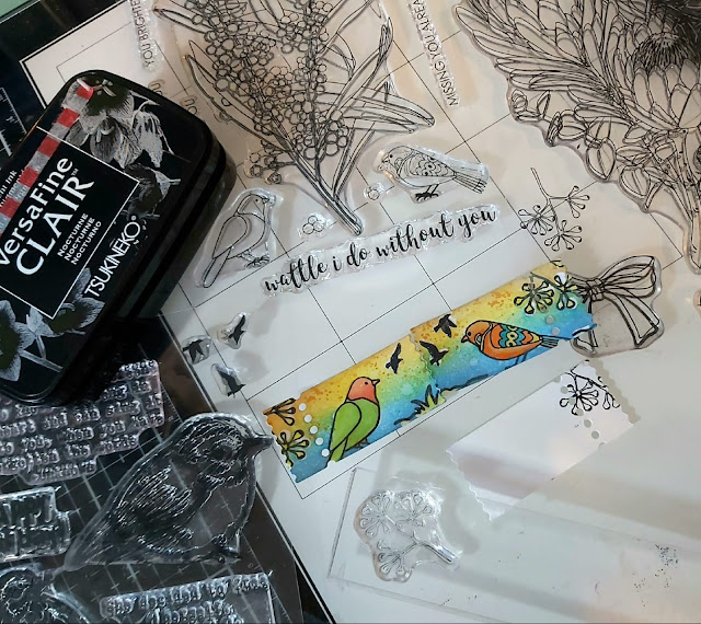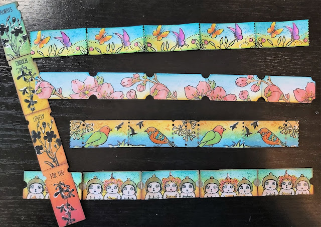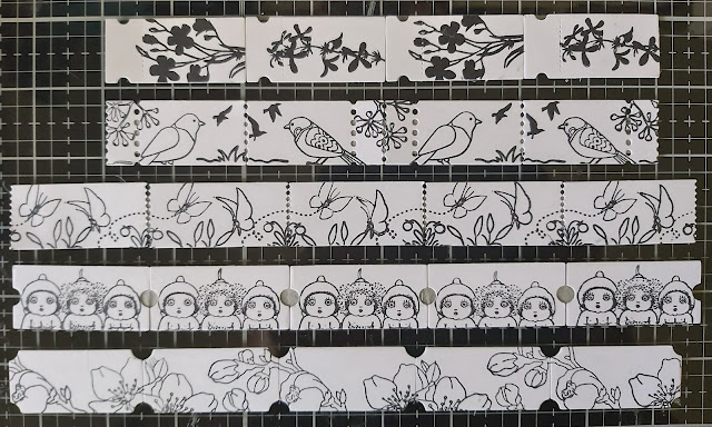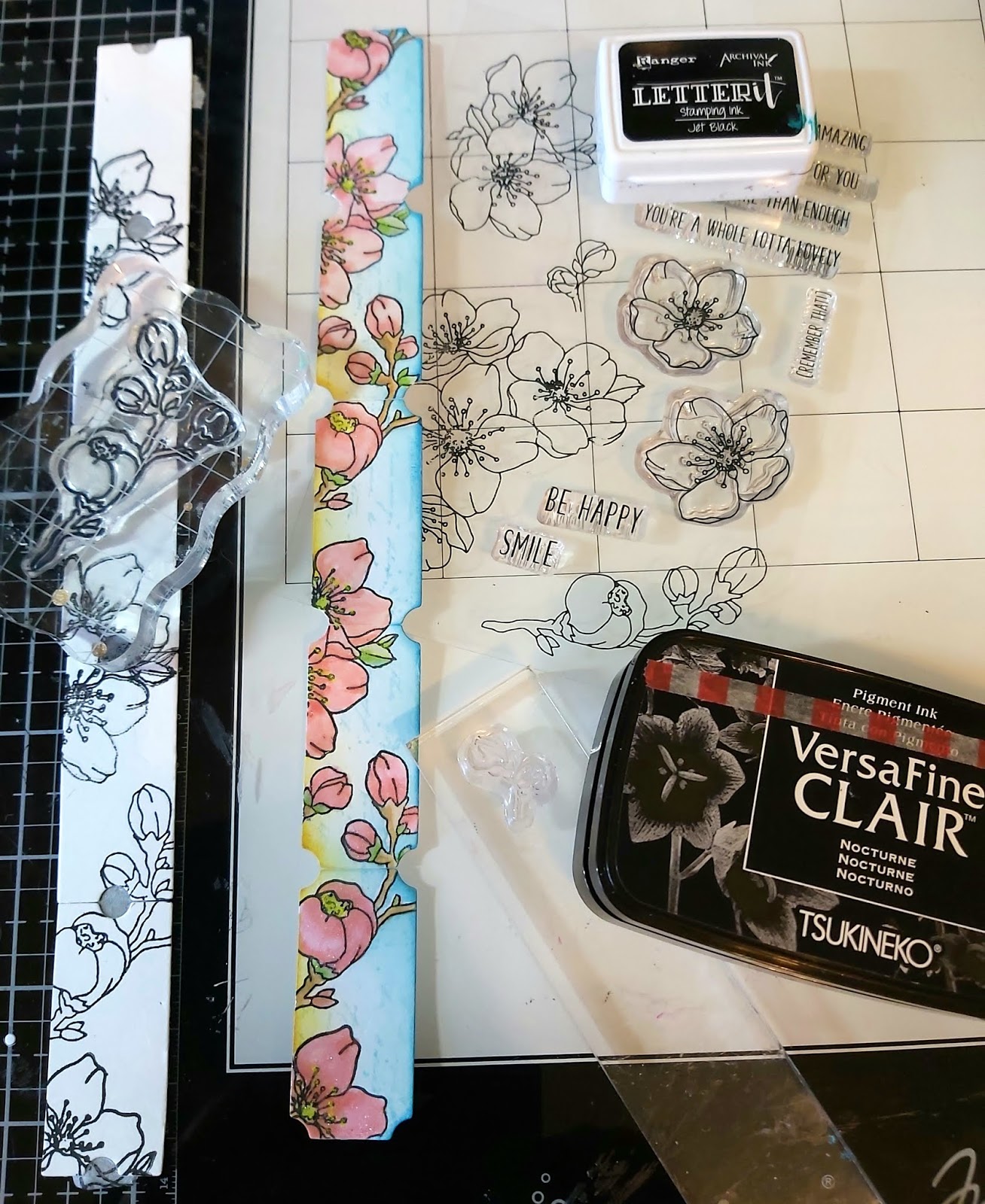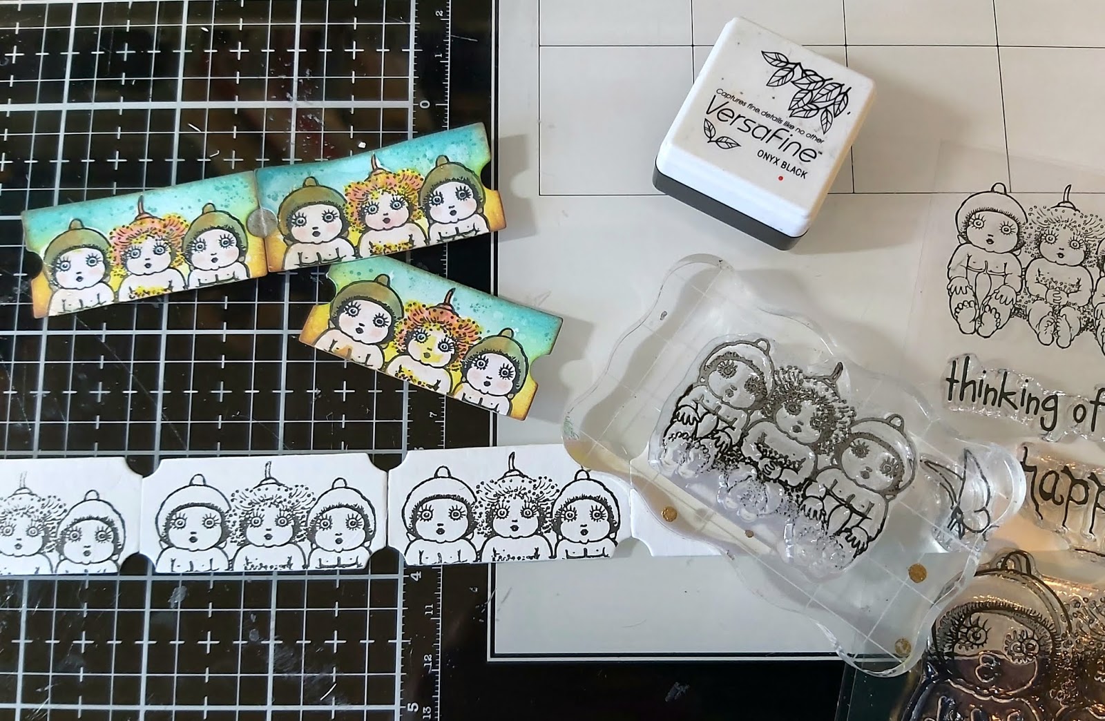 I then stamped with Black Archival Ink in repetitive patterns across the tickets.