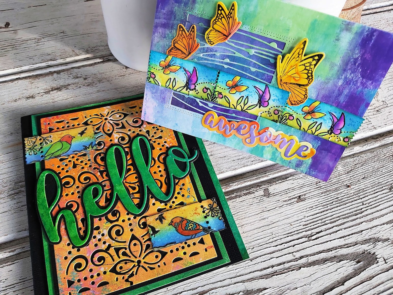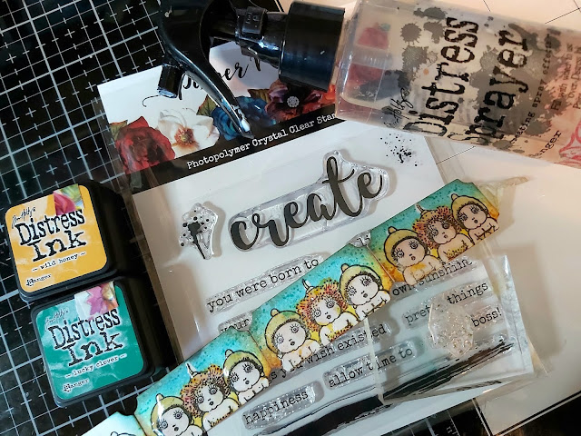 Flicking water & drying with a heat tool gives even more visual texture.The glossy accents on the focal image resists the Distress inks used on the background.