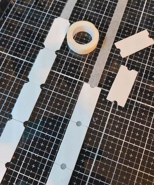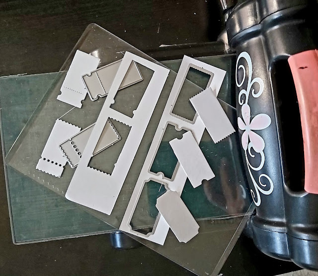 The Ticket Die set has 5 various shaped tickets. I cut out multiples of each from white cardstock.