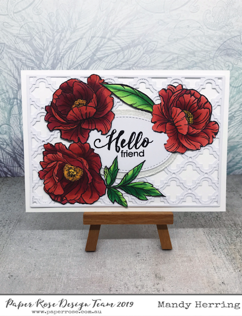 Today for Paper Rose I would like to share a series of cards using the gorgeous Peonies Stamp Set. For fun lets use some Christmas colours!