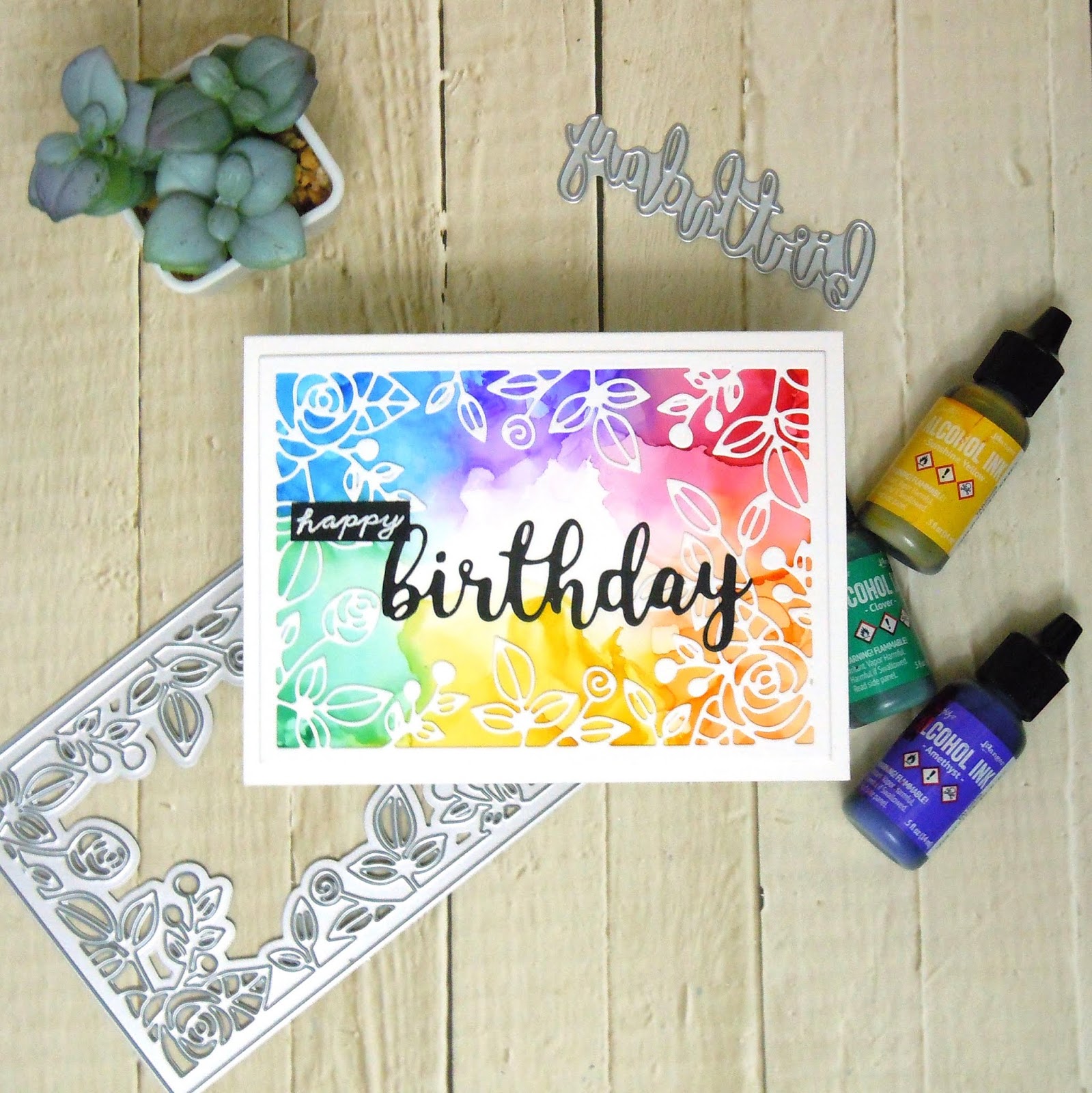 I started by making a rainbow background with alcohol inks on Yupo and adhered this to a white card base. I cut the Rose Rectangle Border die from white cardstock and adhered it over the Yupo panel. I cut the Birthday die from black cardstock and adhered it to the centre of the card. I wrote the word "happy" on a scrap of black cardstock in white gel pen and adhered it to the card.