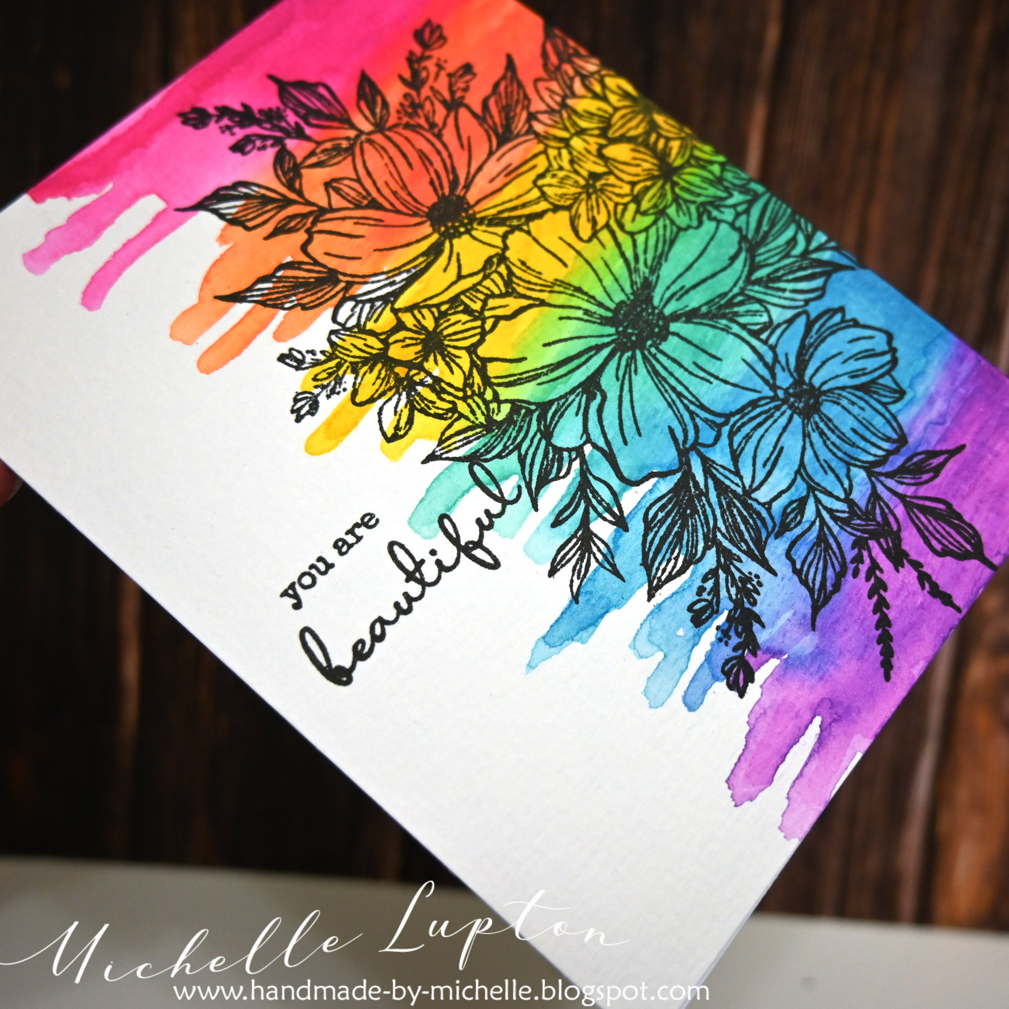 I created the rainbow background by swiping a rainbow of Hero Arts Reactive inks to one edge of a piece of watercolour paper. I then used a water brush to blend the colour and create the drips. I then stamped the flowers from Milly's Bouquet and a sentiment from the same set with a black pigment ink.