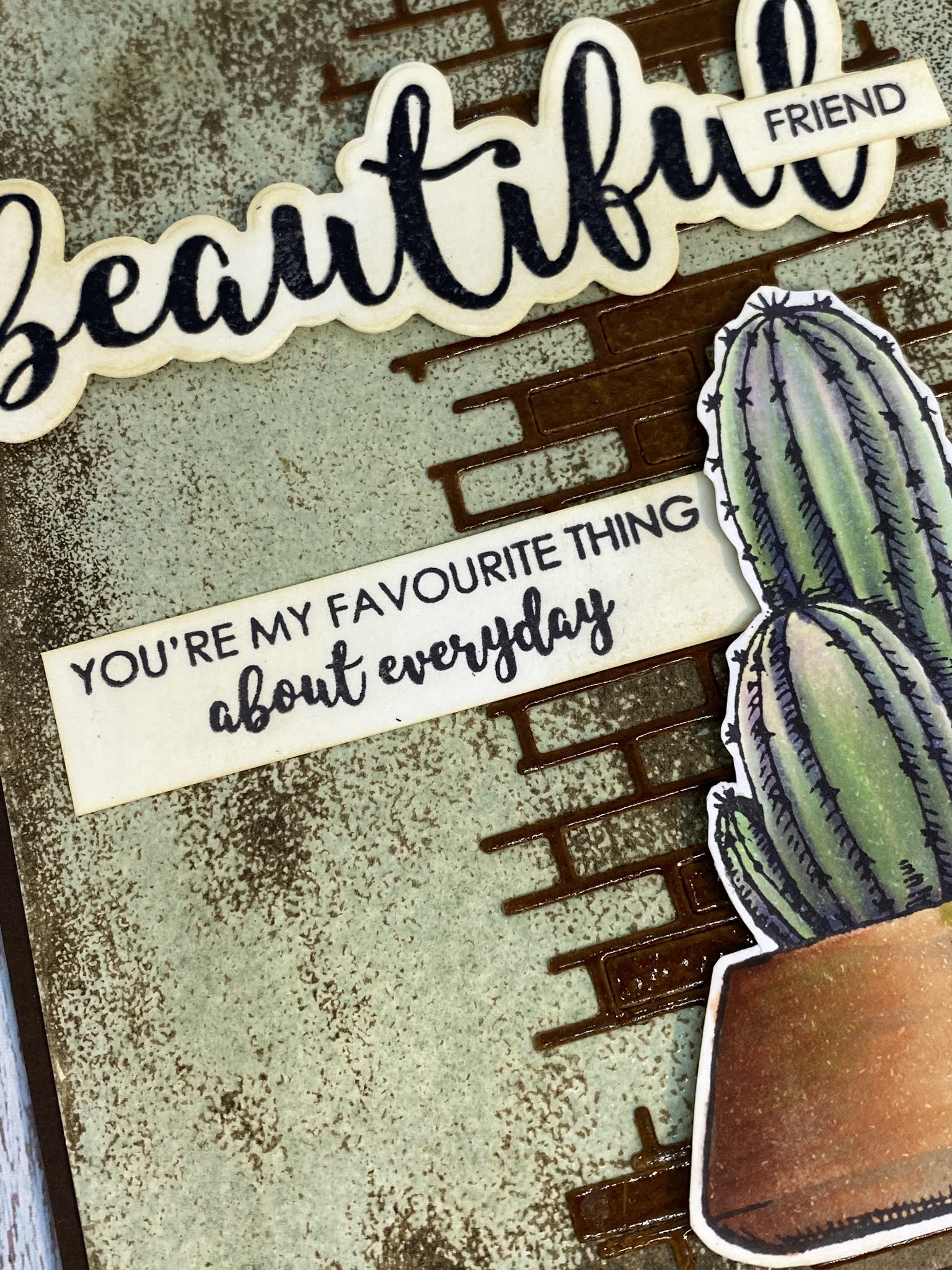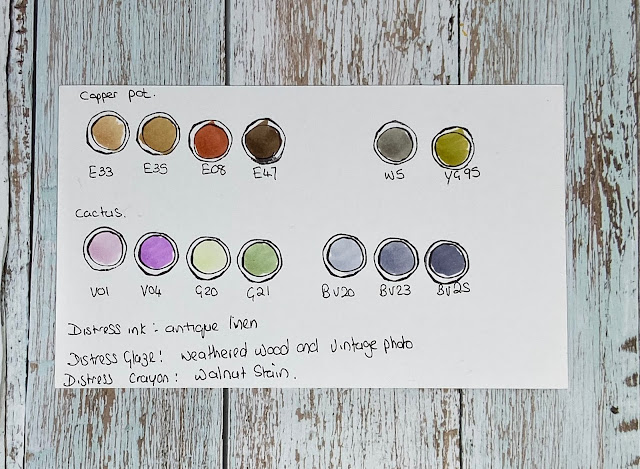 I have stamped out my succulent stamp in Memento Tuxedo Black ink and coloured in with my Copic markers. I have used colours for my pot so that it looks like aged copper.