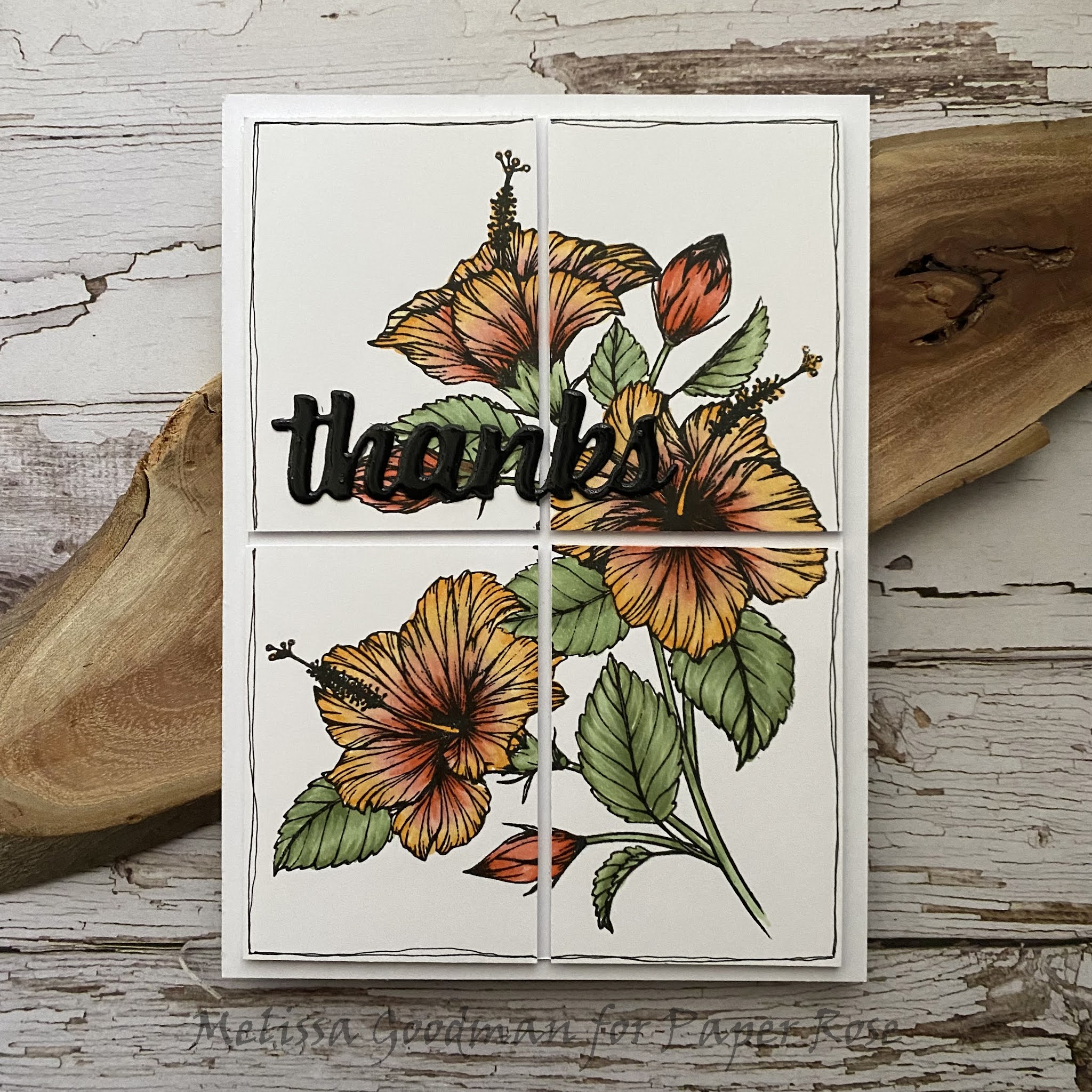 - On a piece of X-Press It Blending Card (14 x 10cm) stamp Sketchy Hibiscus with black ink. Colour with Copic Markers.