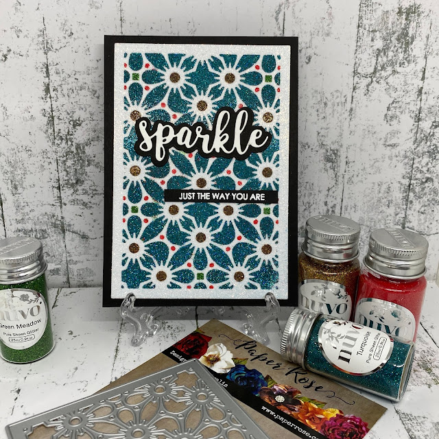 To create this look she has used a paper piecing technique but instead of coloured card ....glitter!