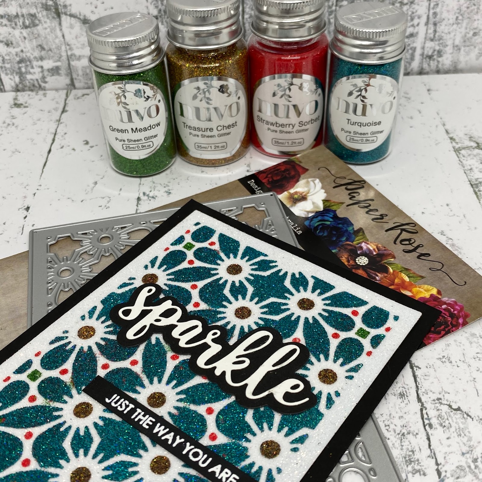 I love the final result of the background and all I did to flatten out the glitter was to cover the whole completed background with a piece of paper to protect it and burnished it with a bone folder to make sure everything was nice and flat and well stuck down.