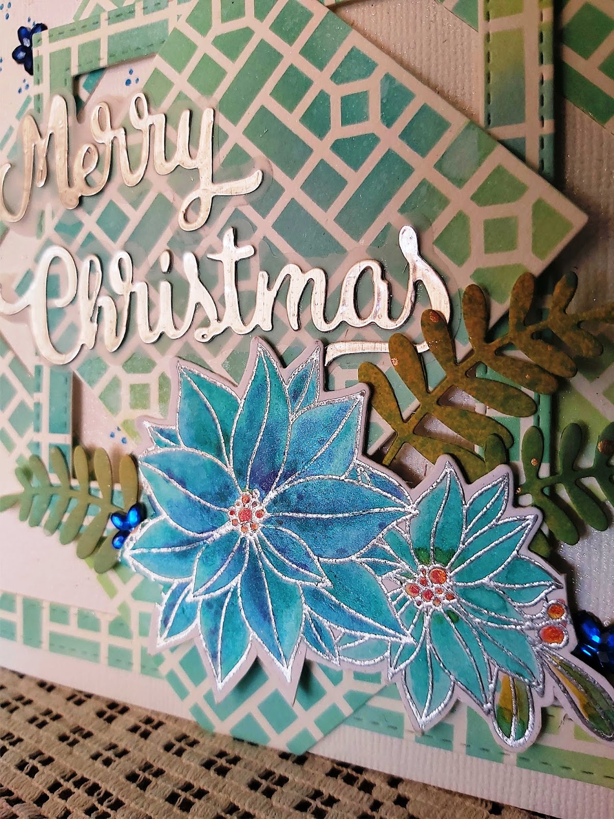 The Poinsettia stamp set was silver heat embossed & coloured with Twinkling H20 watercolours.