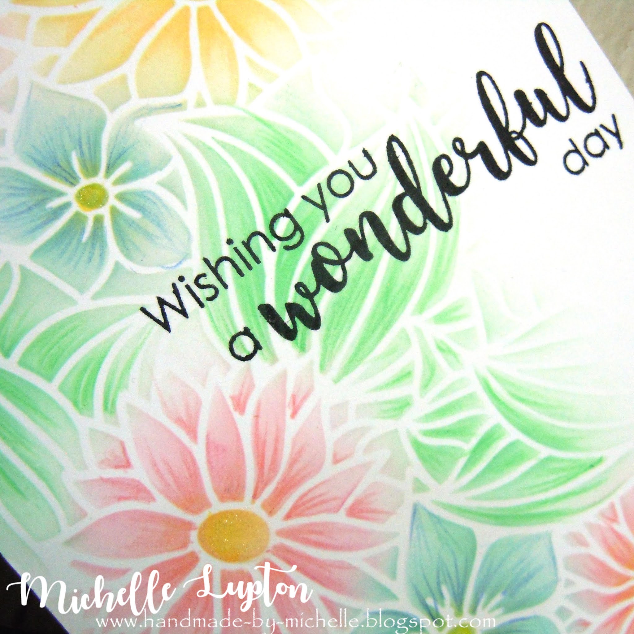 I used the Spring Flowers stencil with small blending brushes and Distress Oxide inks. I then coloured over the flowers and leaves with Derwent pencils to give more definition. I then stamped the sentiment in black in and I was done!