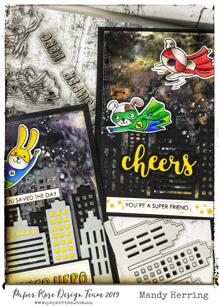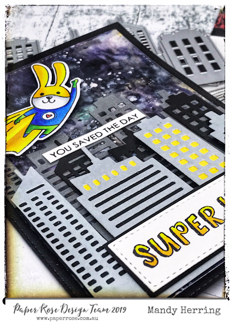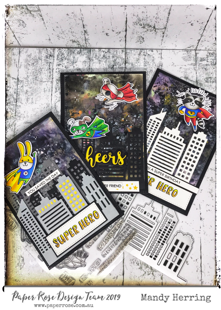 The buildings in each of the cards are the new Tall Buildings Border Die. In the card above I have cut out 3 sets of this Die in varying colours and layered them up using double-sided foam tape.