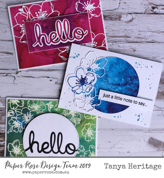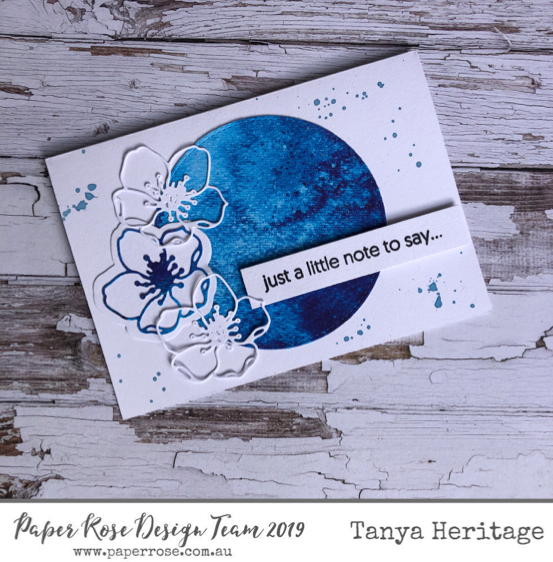 One circle die from the Stitched Circles Dies 16548, three flowers cut from the Blossom Outline Dies 18168, a little stamped sentiment from Hello Stamp Set 17304 and a few splatters of blue distress oxide and you have this gorgeous and simple card.