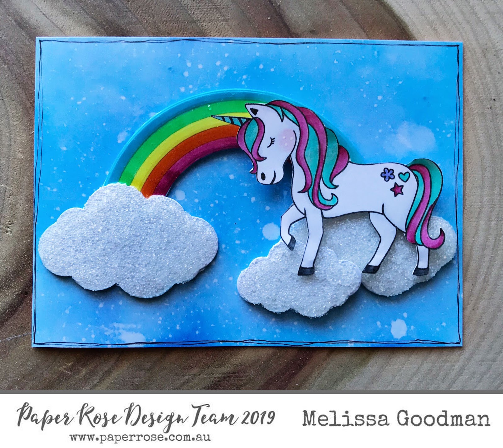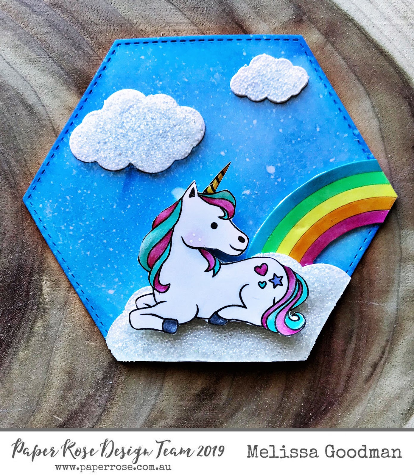 - Stamp, colour and fussy cut unicorn. Adhere to card base using foam tape.