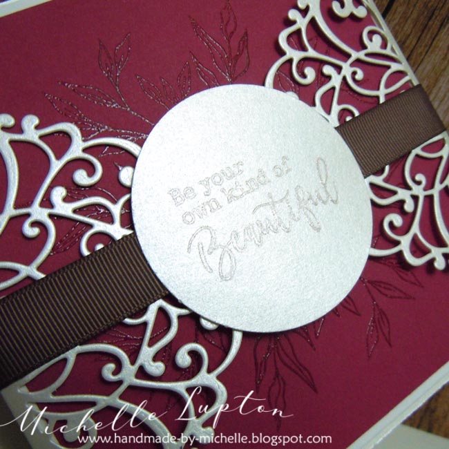For this card, I began by creating the wrap, using the corner die on some pearl cardstock from my stash. I then created a 5inch x 5inch white card, and cut a slightly smaller panel of dark pink cardstock for the front. I stamped some leaves in a circle onto the dark pink panel using Versamark and then clear embossed them. I then adhered the card inside the wrap. I stamped the sentiment onto a circle of the pearl cardstock with brown Versafine ink and clear embossed that as well. I adhered the circle onto a piece of brown grosgrain ribbon from my stash wrapped around the card, so that the ribbon can be removed by the recipient to open the card within.