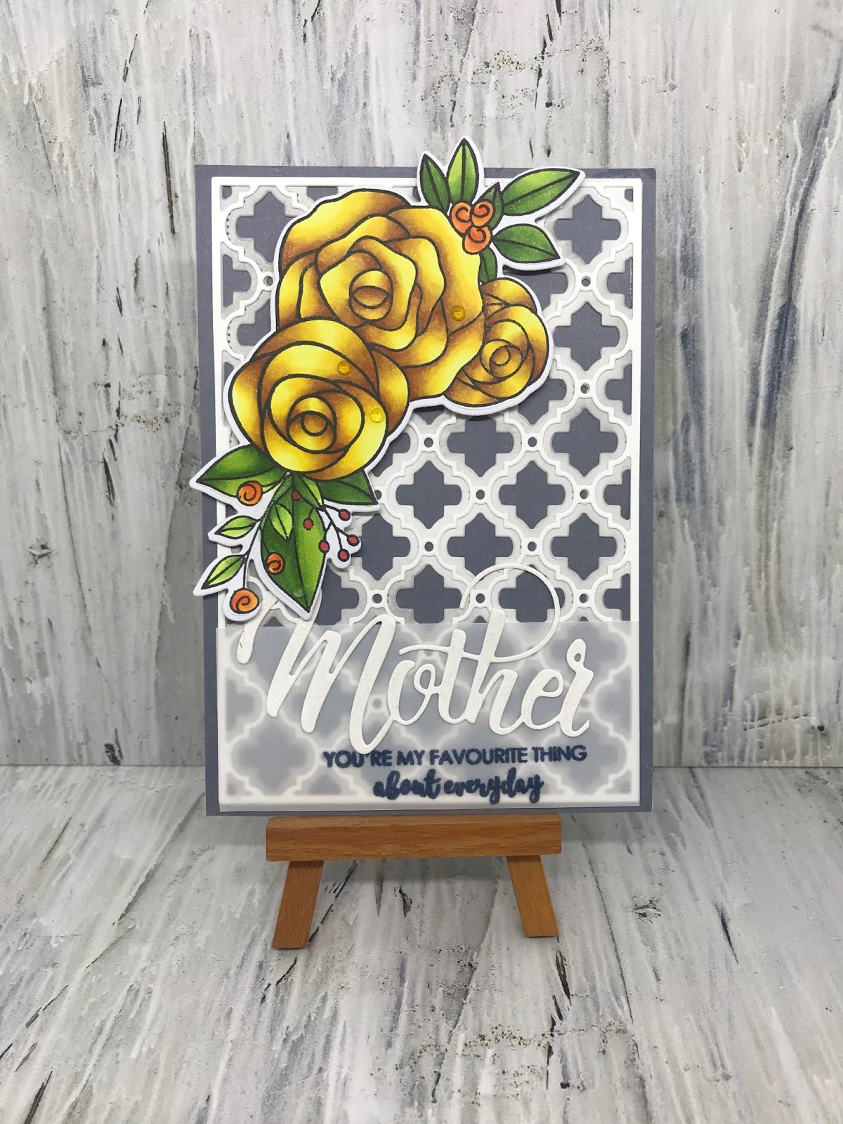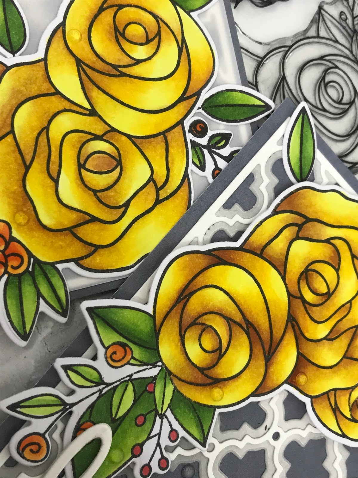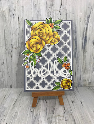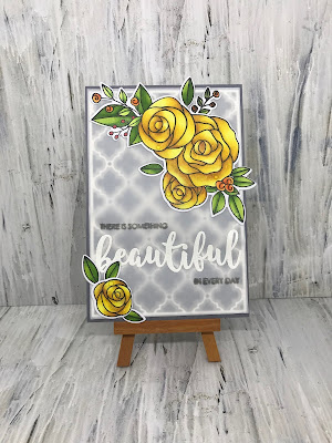 The Roses and leaves are coloured with Copic Alcohol Markers and I just love yellow roses especially with a grey background.