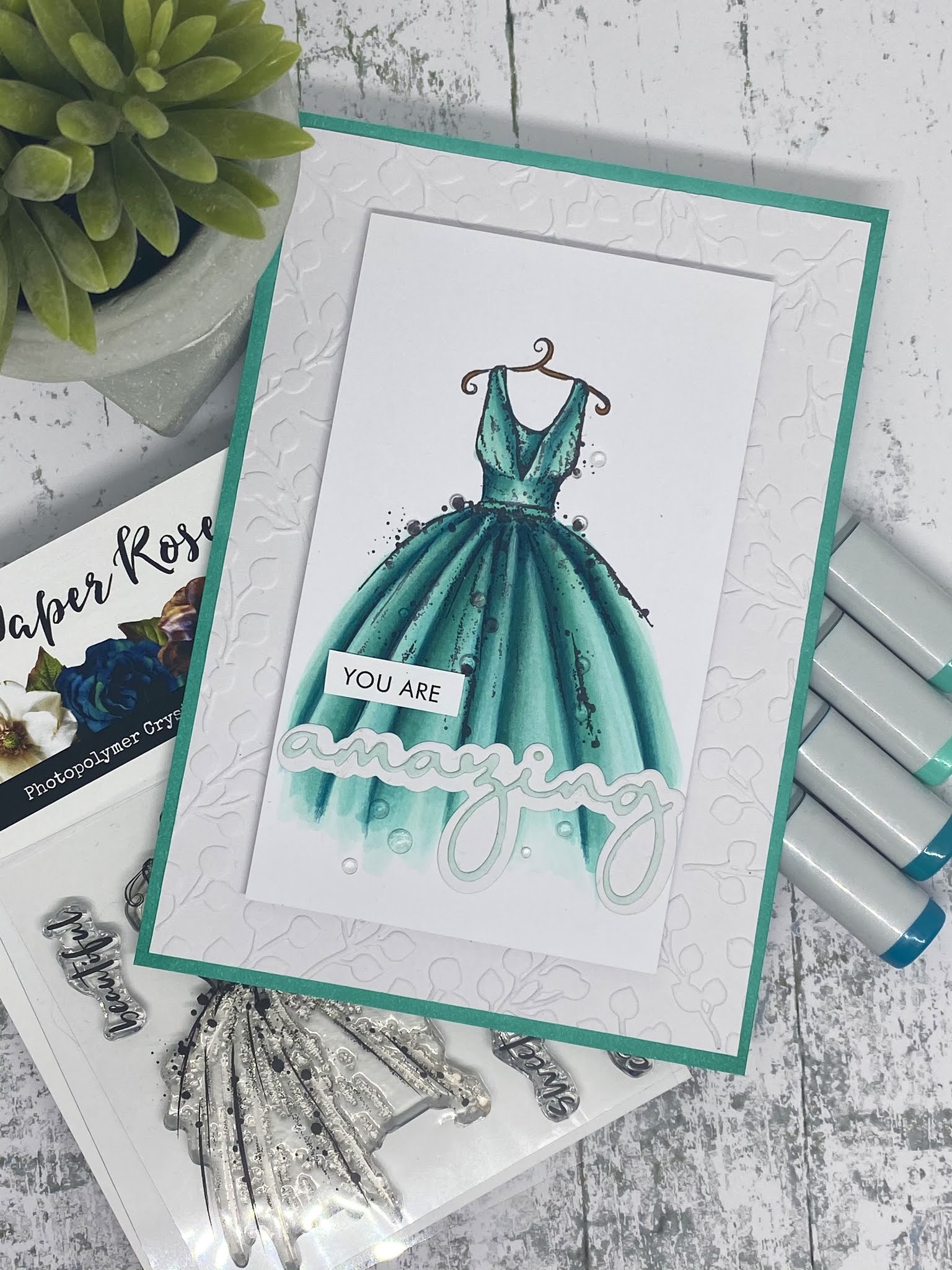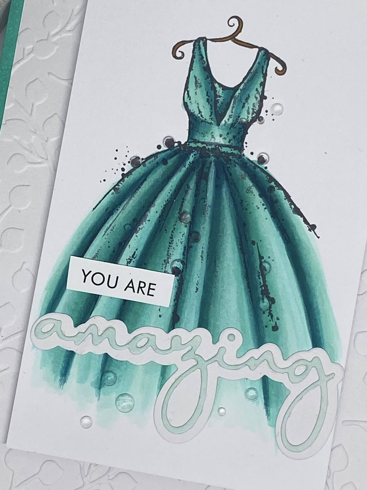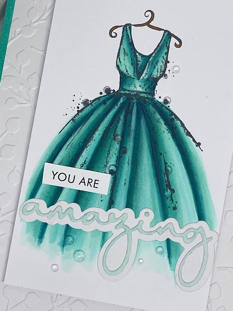 After stamping in Memento ink I have used copic markers to colour in the dress keeping dark shadows